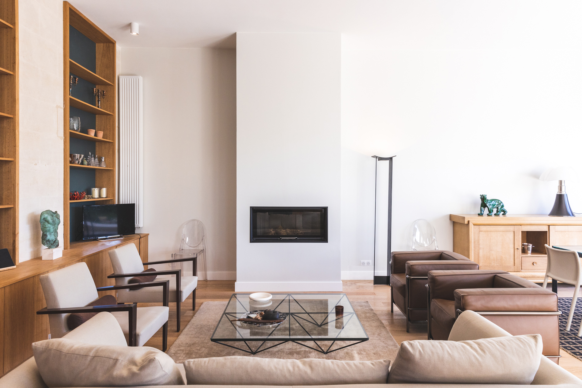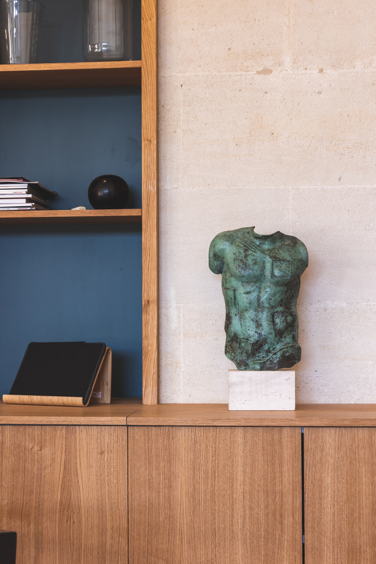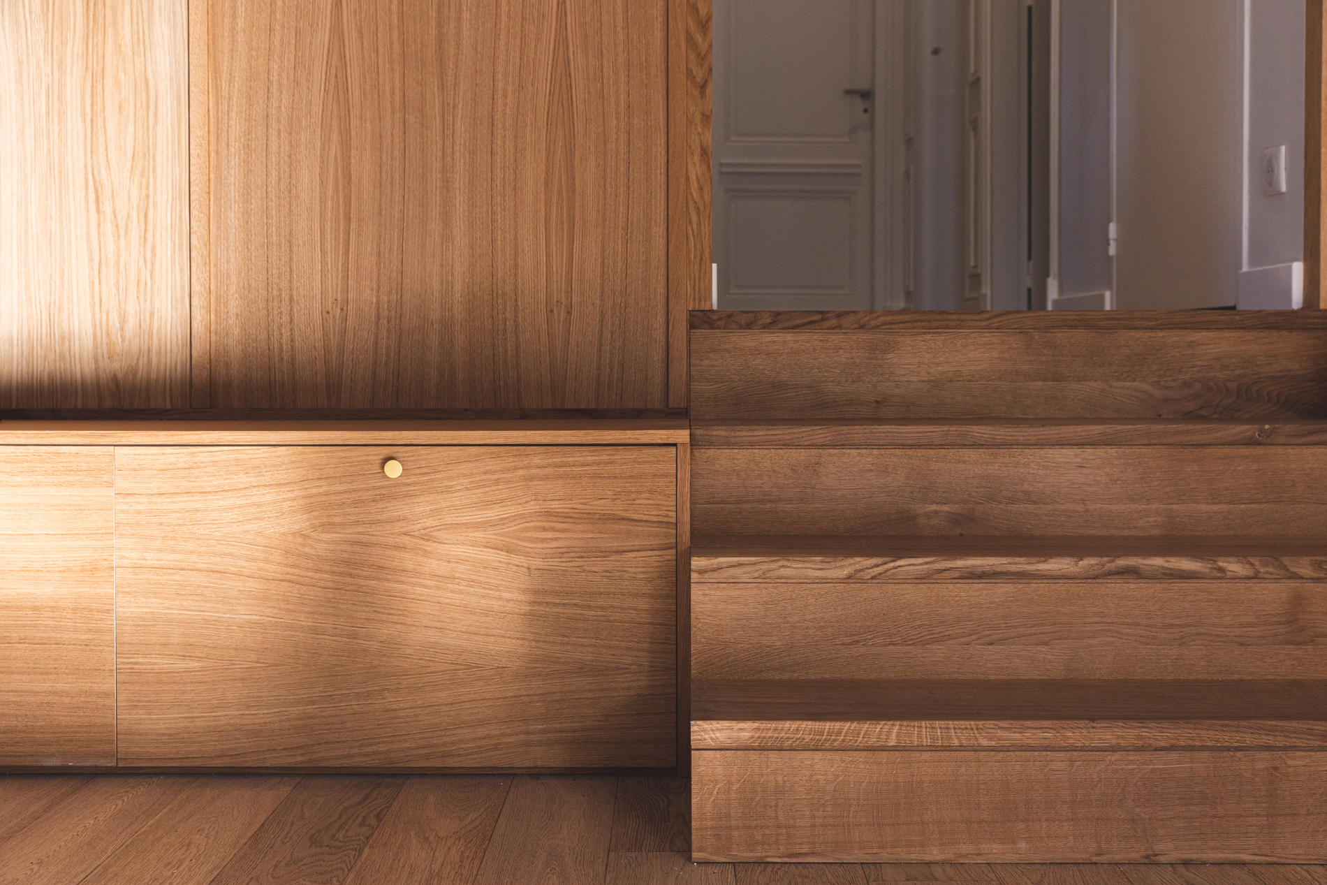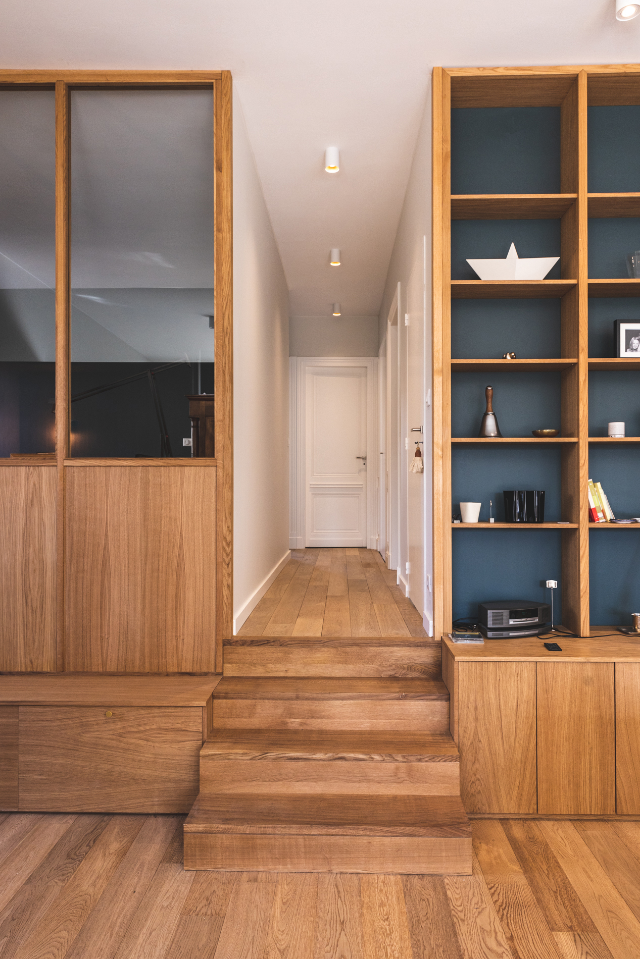 Pour cela, une extension préexistante est supprimée, permettant d’ouvrir largement la façade. Le séjour décloisonné devient un véritable lieu de vie. Les éléments de mobiliers structurent l’espace s’anime au rythme de la lumière qui entre par les baies.