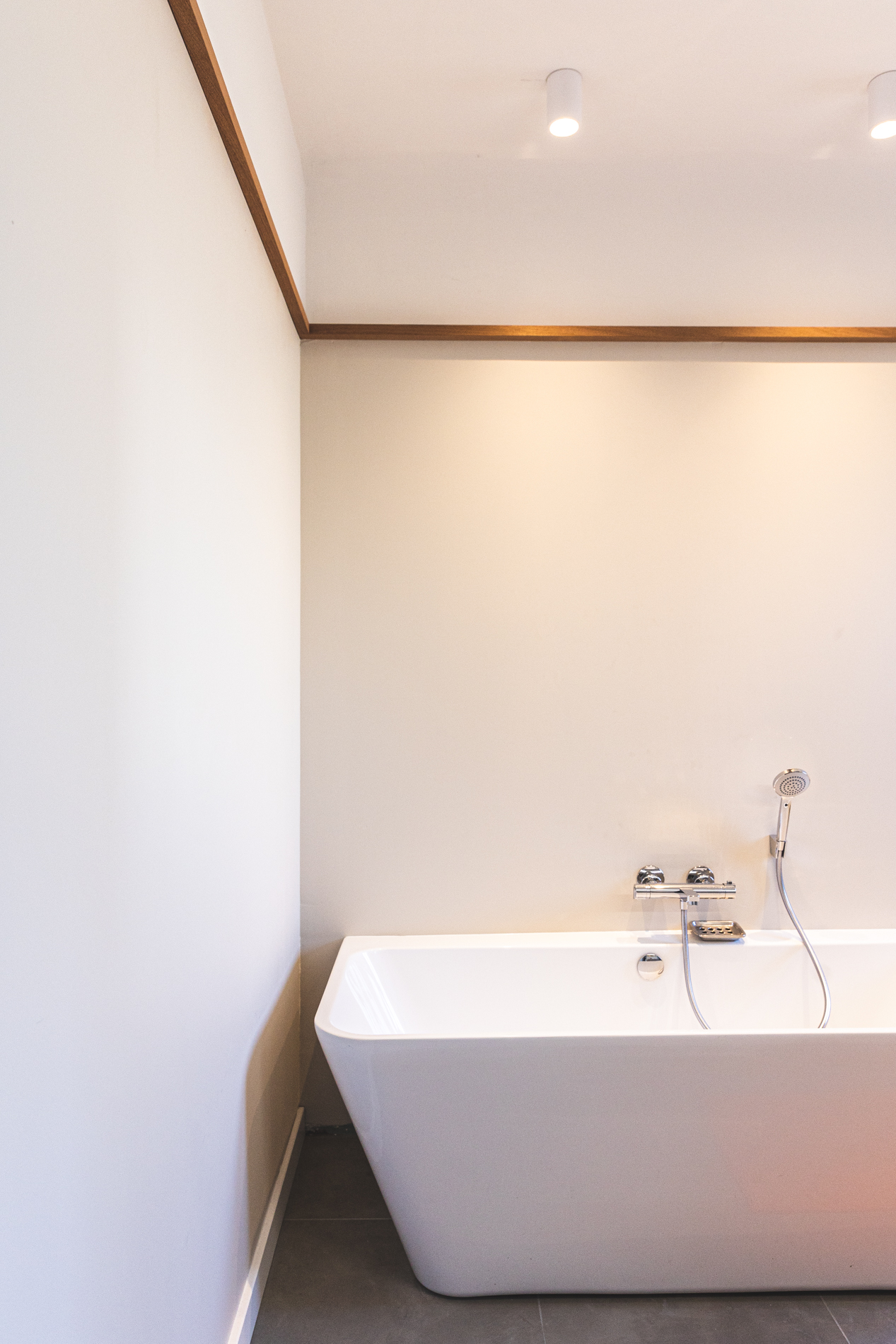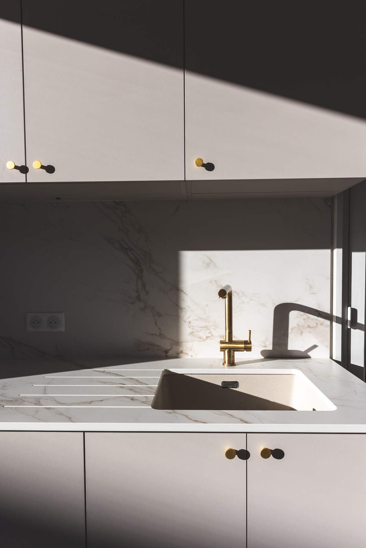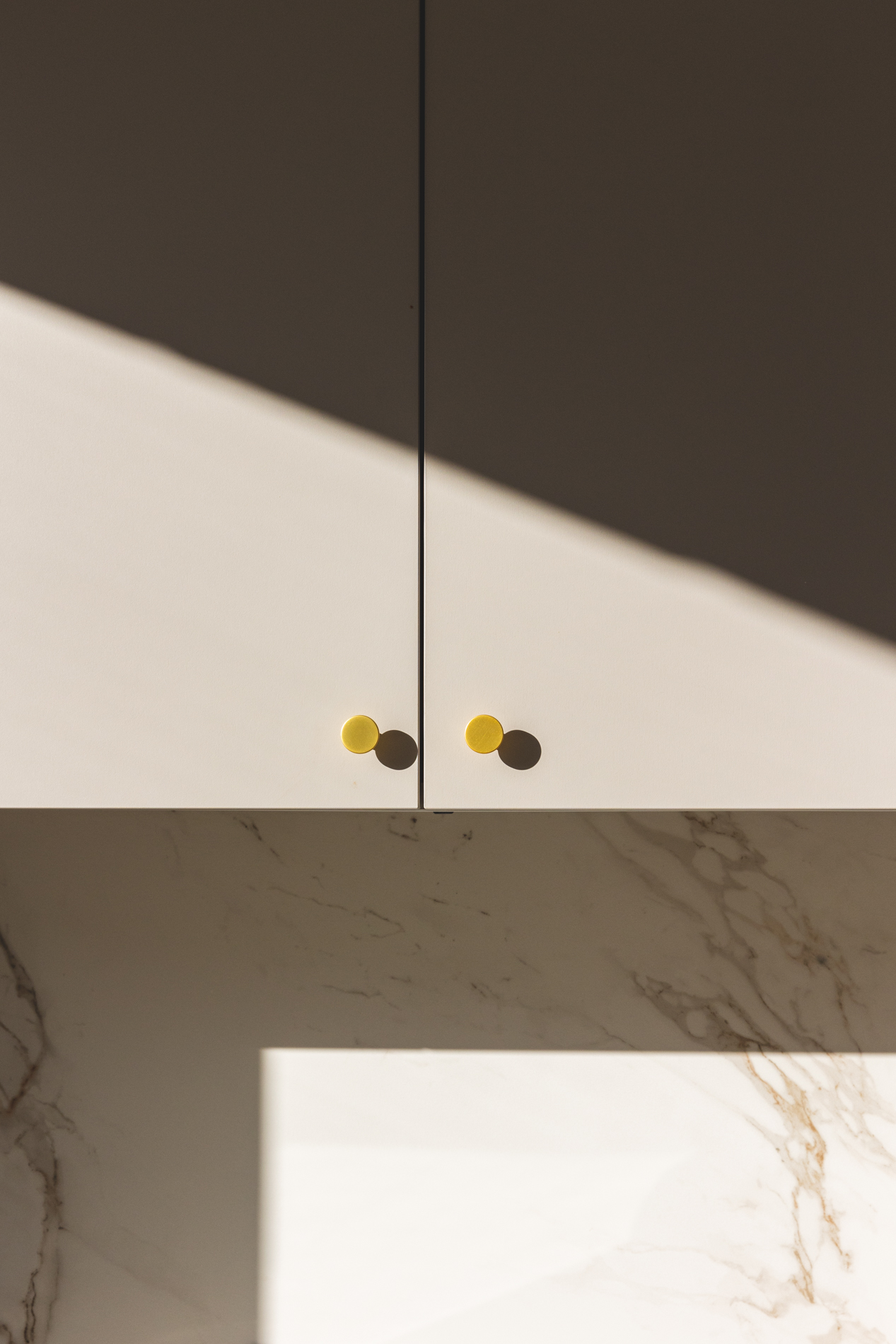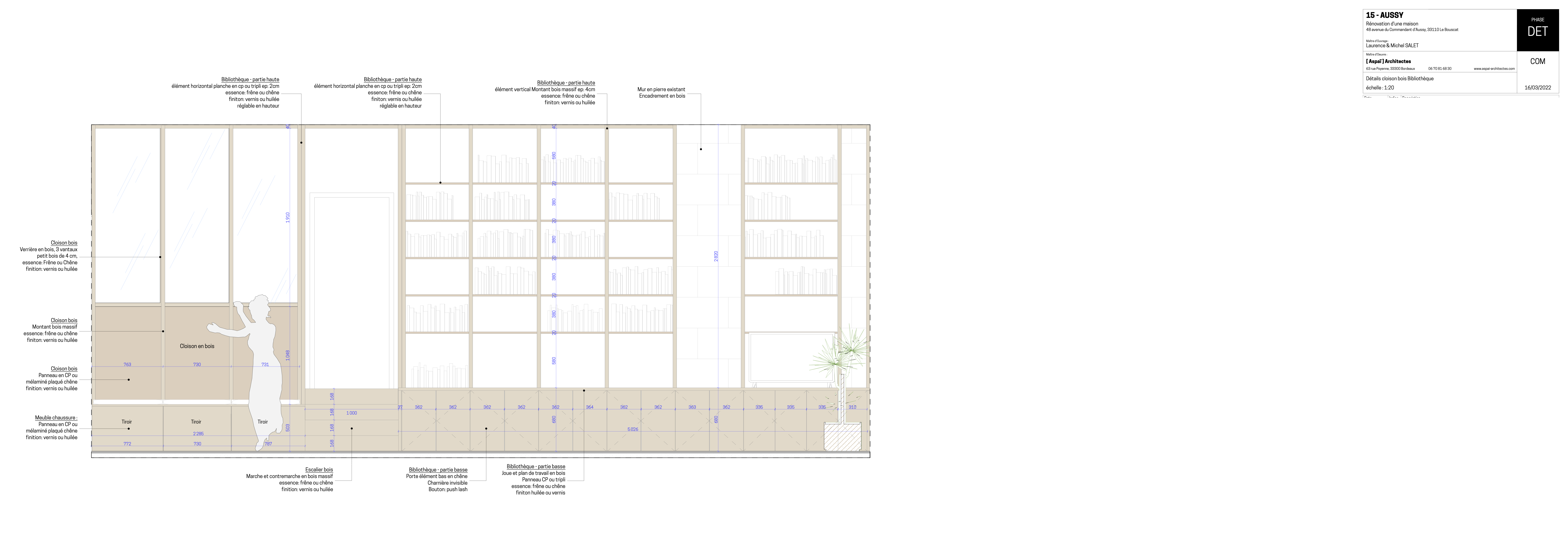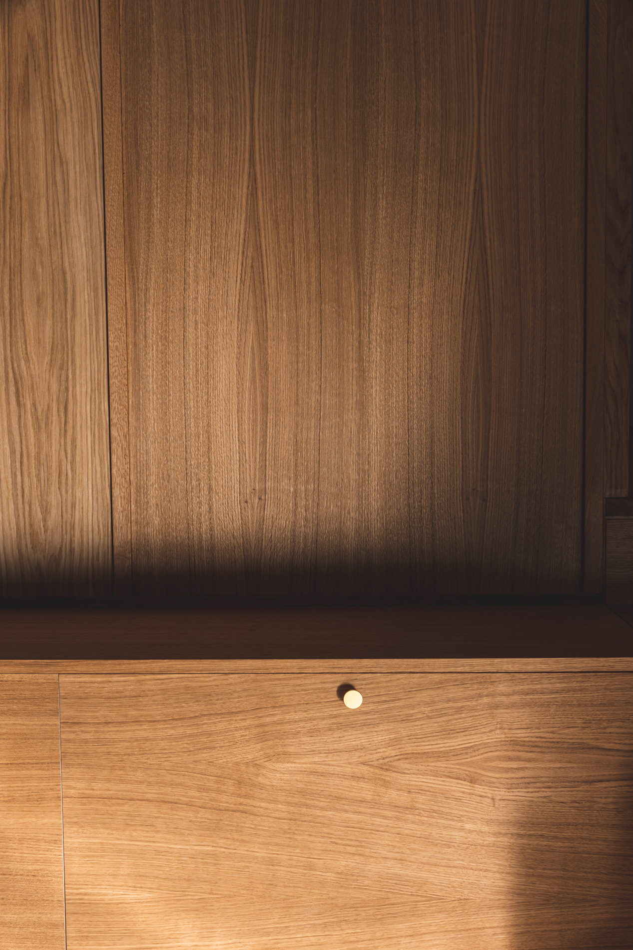 Pour cela, une extension préexistante est supprimée, permettant d’ouvrir largement la façade. Le séjour décloisonné devient un véritable lieu de vie. Les éléments de mobiliers structurent l’espace s’anime au rythme de la lumière qui entre par les baies.