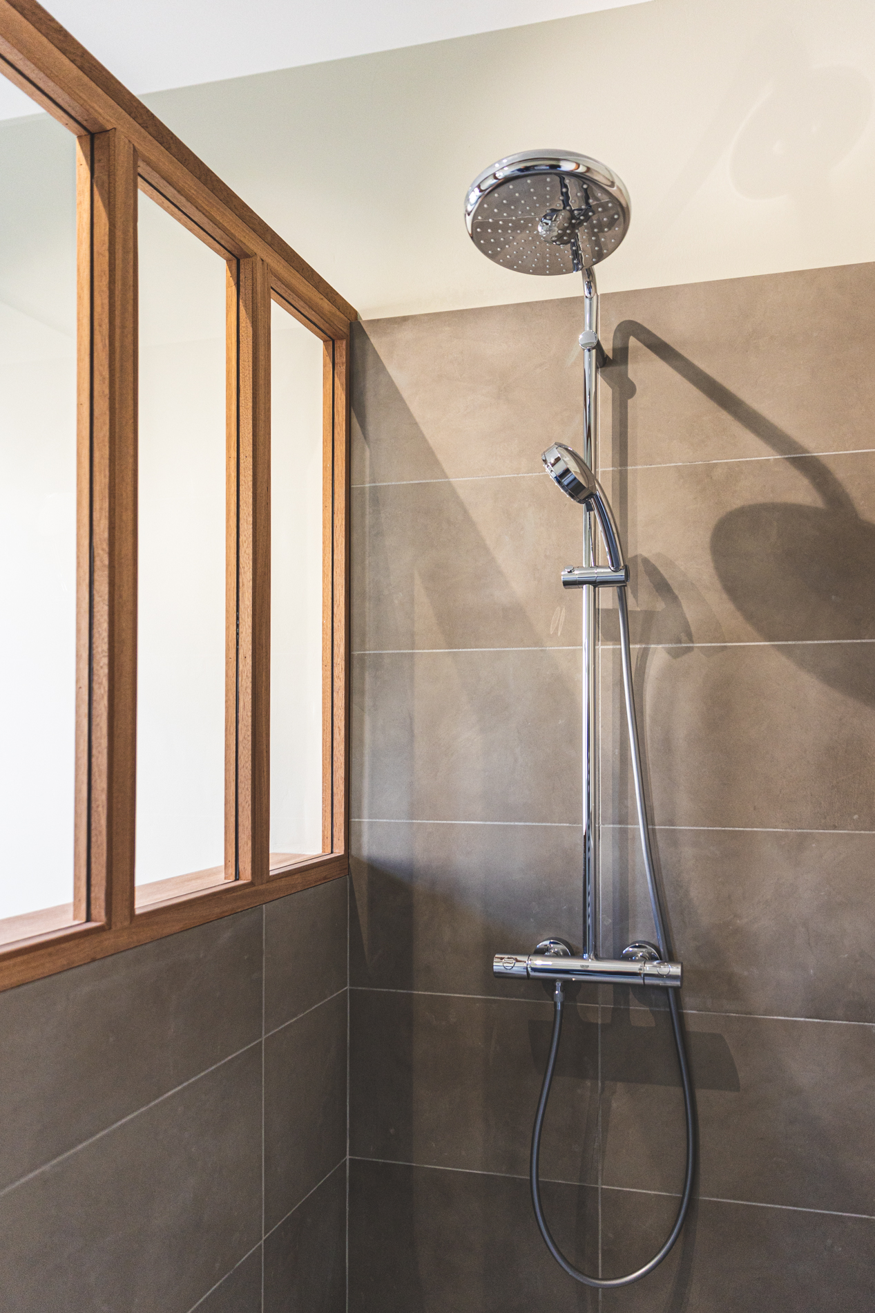 La façade recréée reprend les codes de la maison existante. La façade est barder en pierre massive, et le bandeau en bois à été recréé à l’identique. La terrasse carrelée, aux dimensions de l’extension supprimée, permet de tourner le séjour vers l’ouest, de regagner en luminosité.