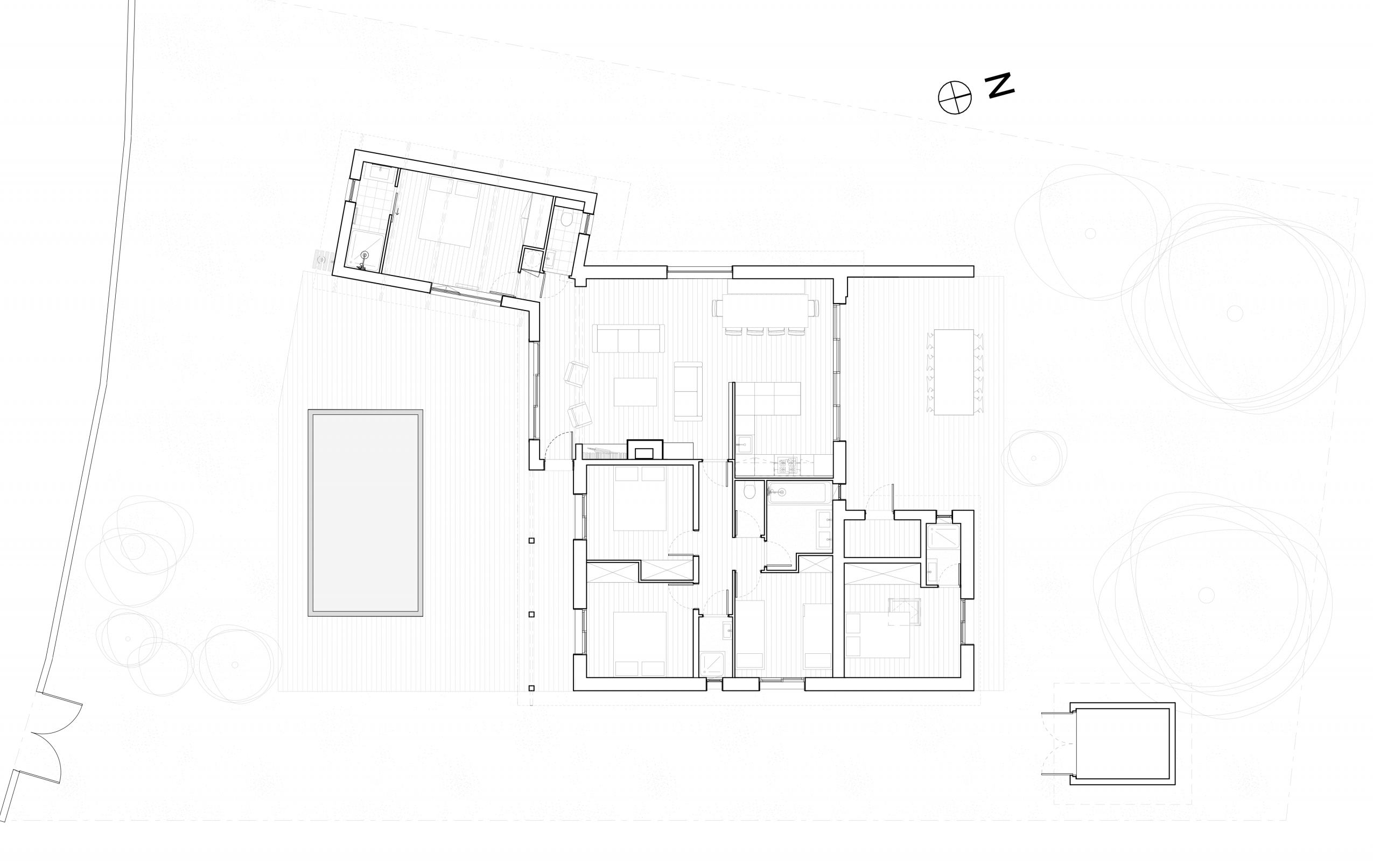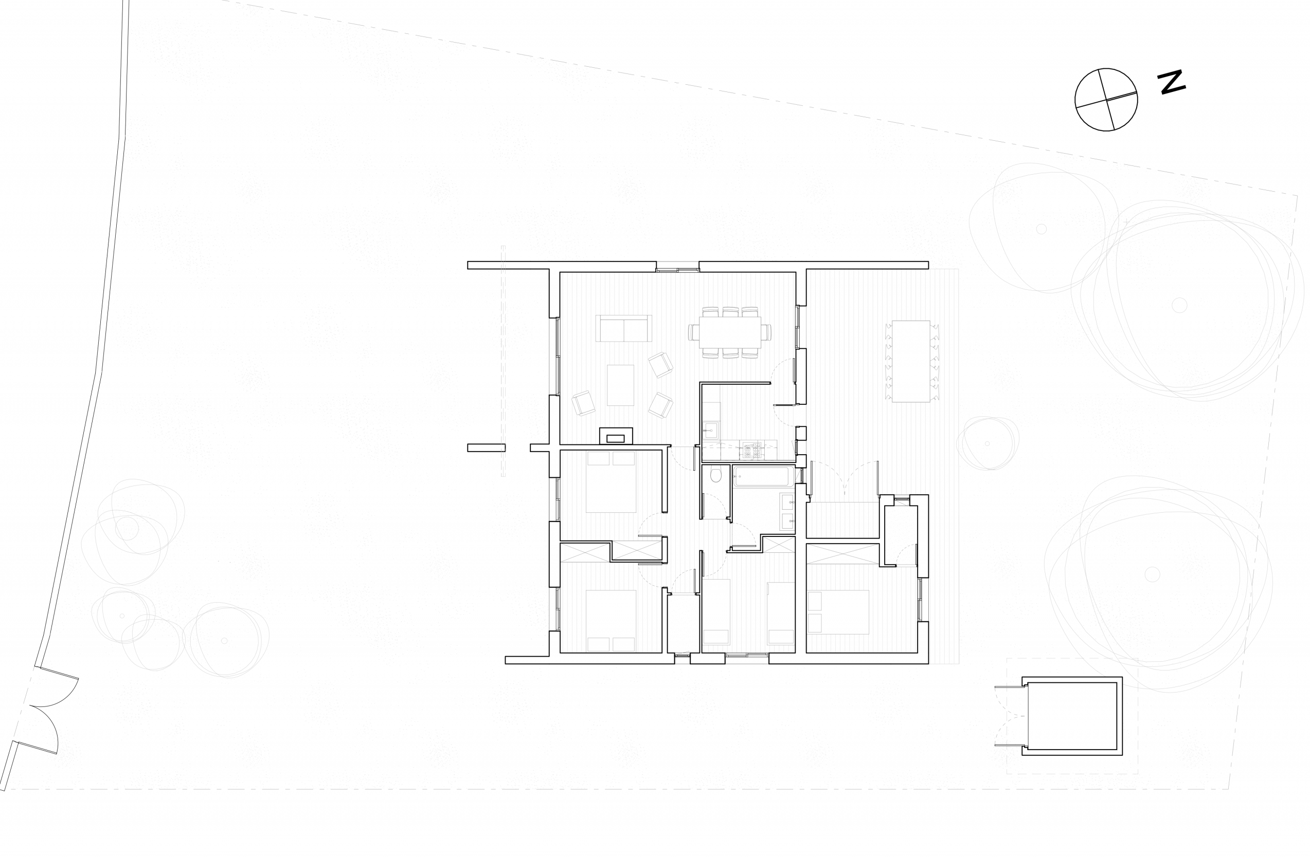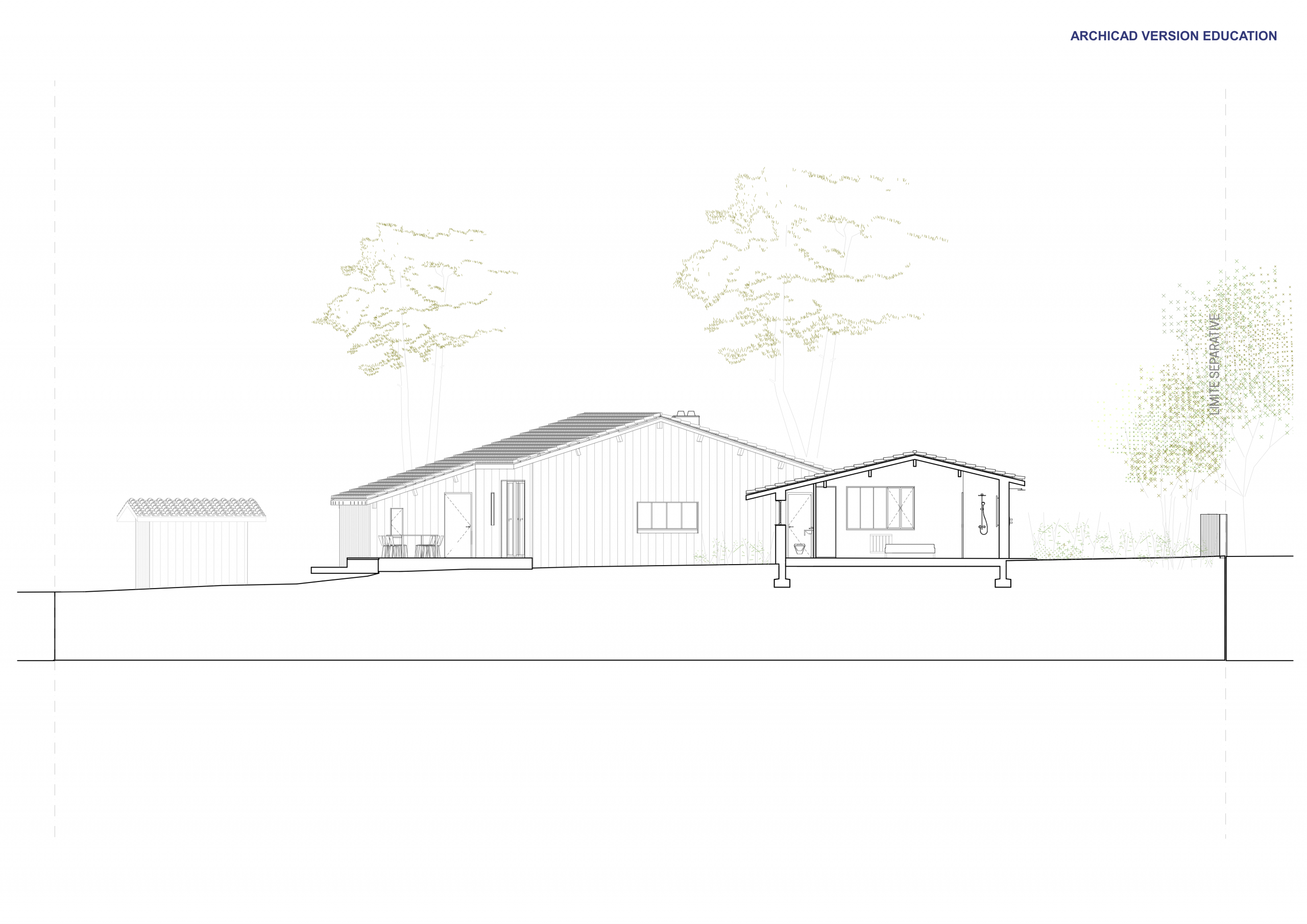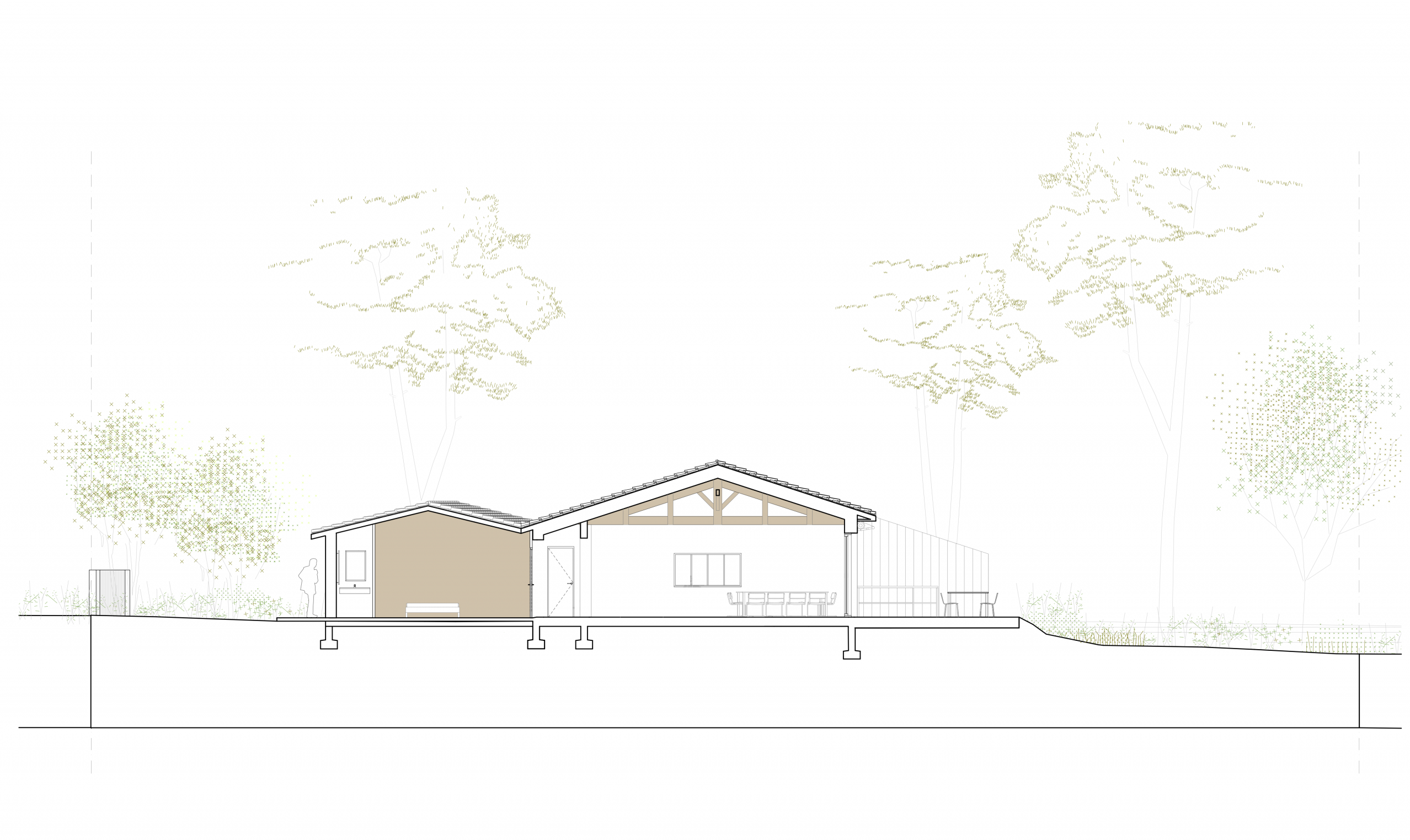 L’extension au Sud vient se rattacher à la maison principale par le séjour. L’extension suit volontairement la parallèle à la limite de propriété afin d’ouvrir l’angle de la terrasse Sud de 10°.