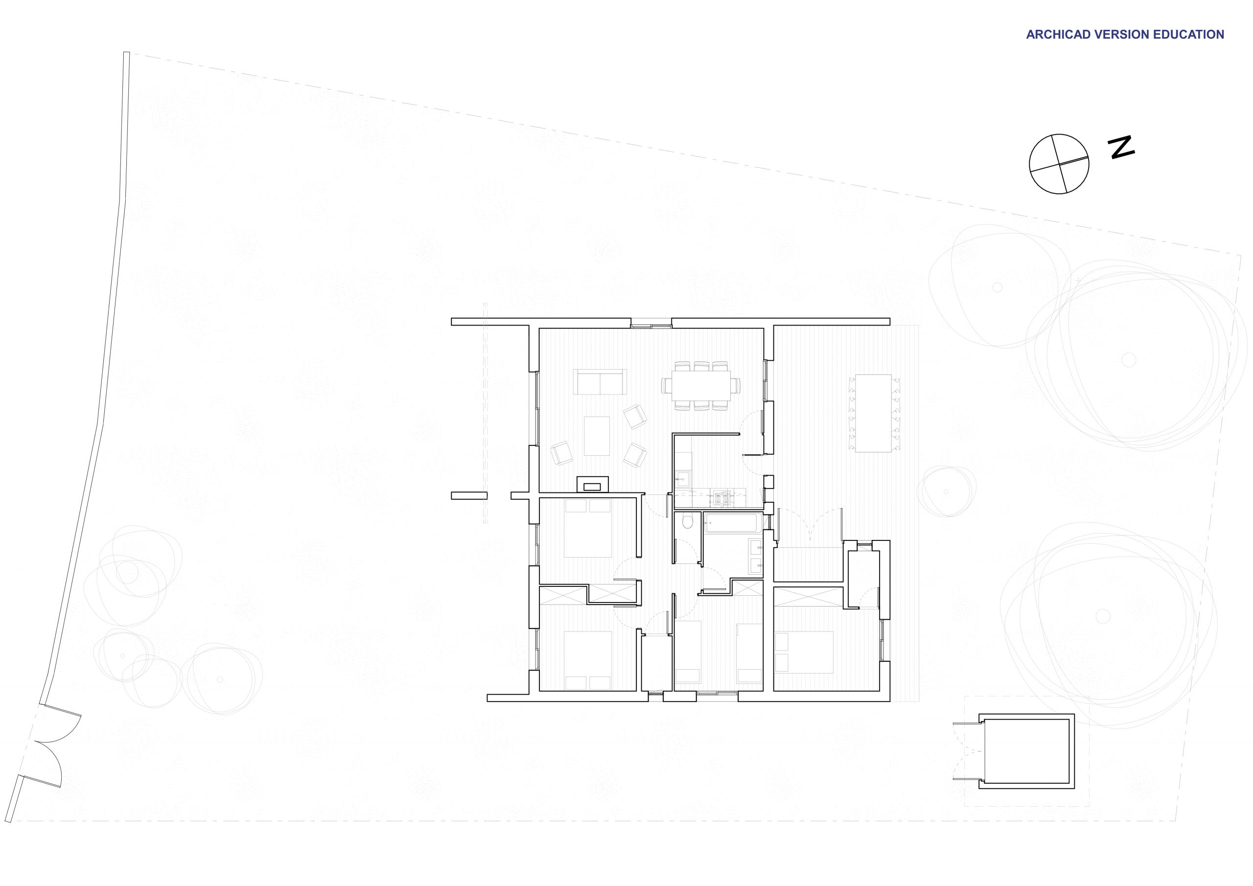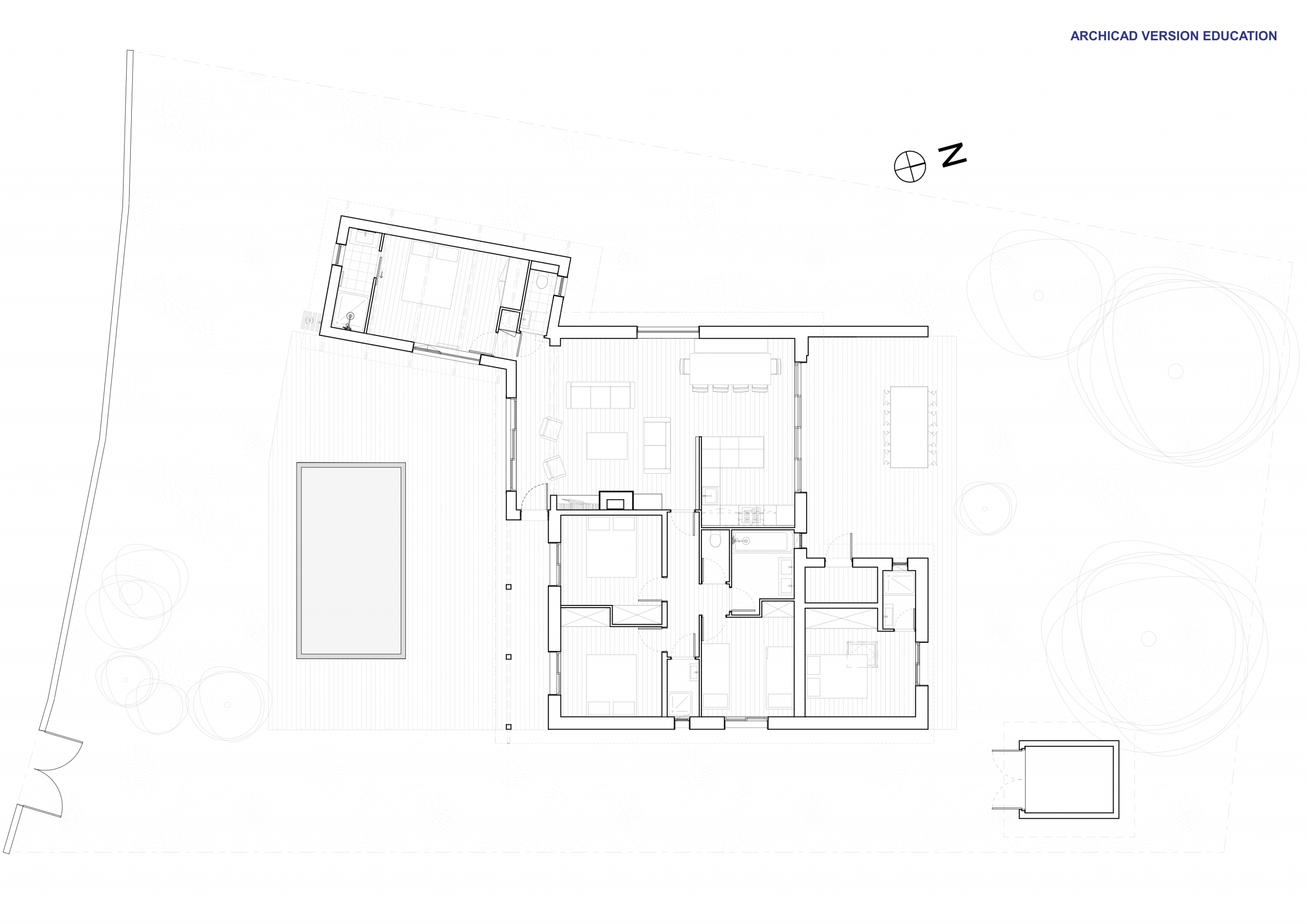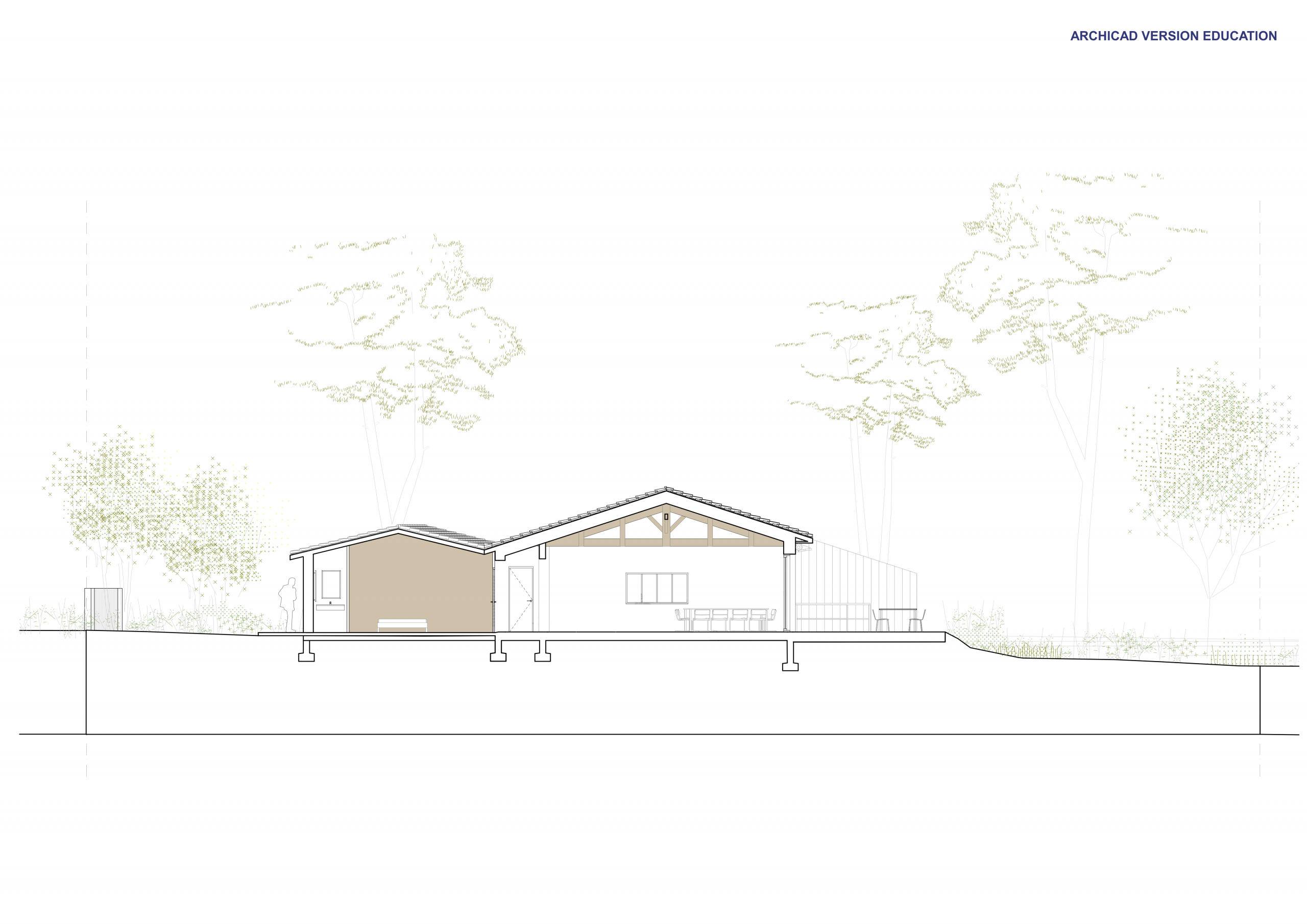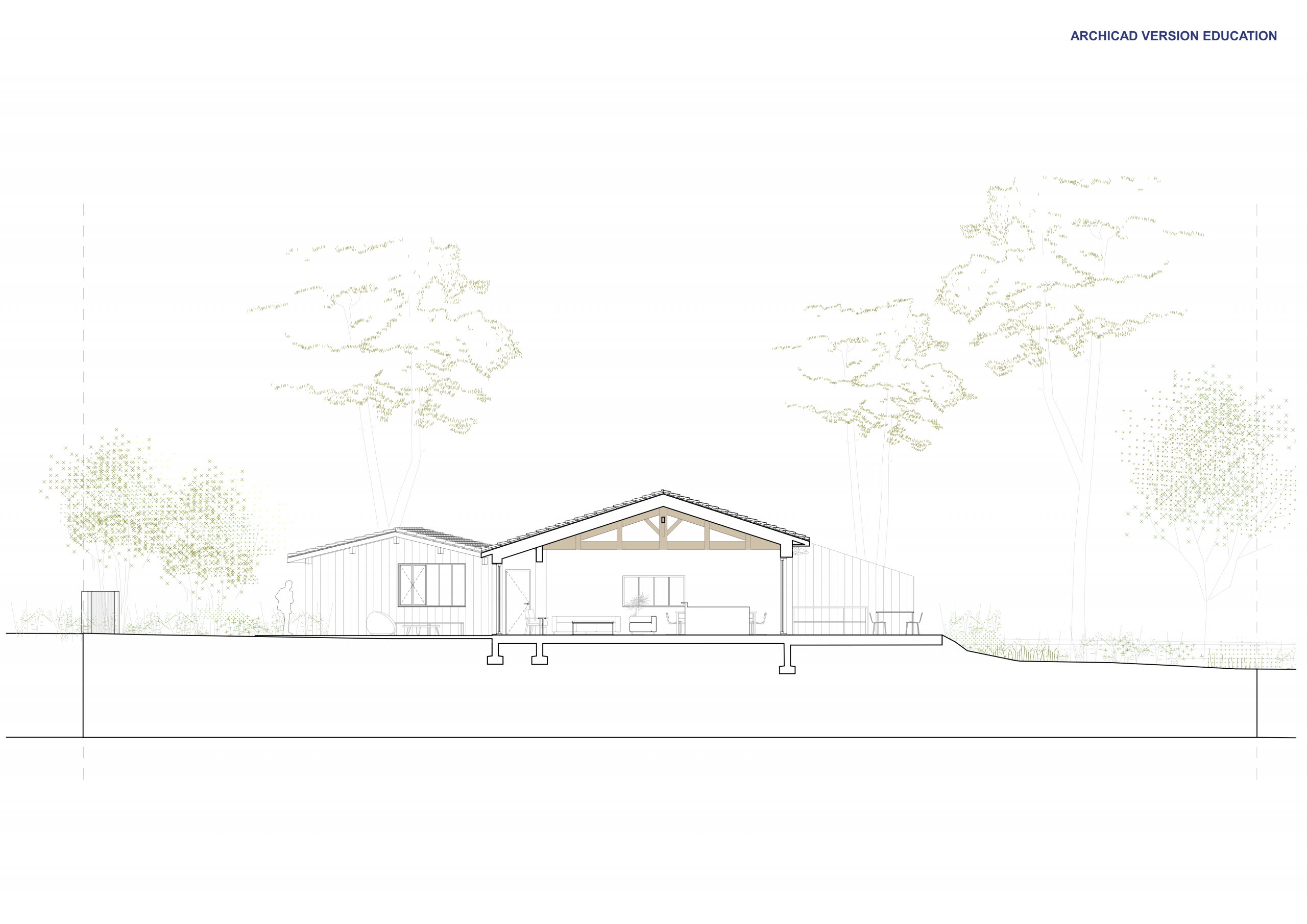 L’extension au Sud vient se rattacher à la maison principale par le séjour. L’extension suit volontairement la parallèle à la limite de propriété afin d’ouvrir l’angle de la terrasse Sud de 10°.