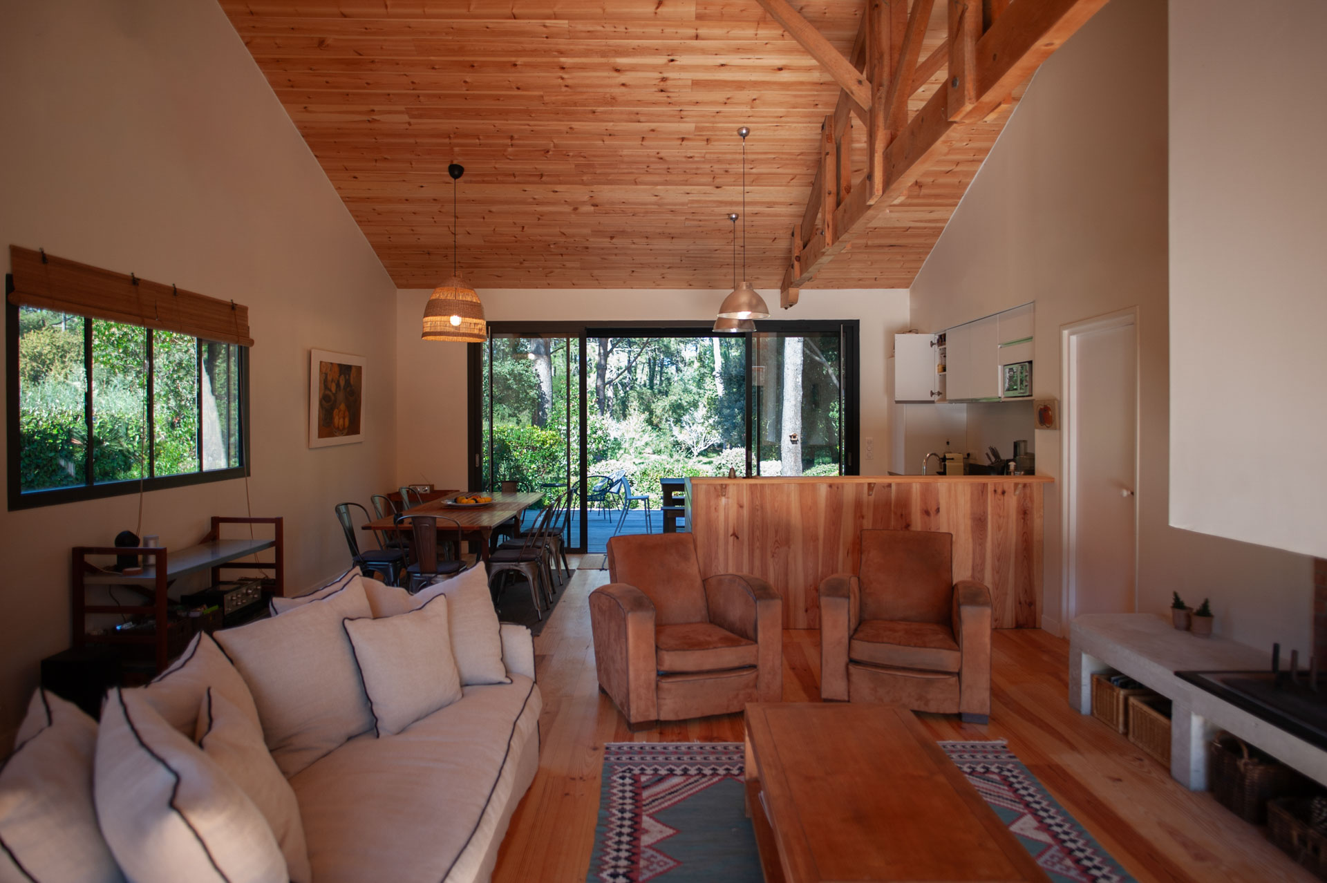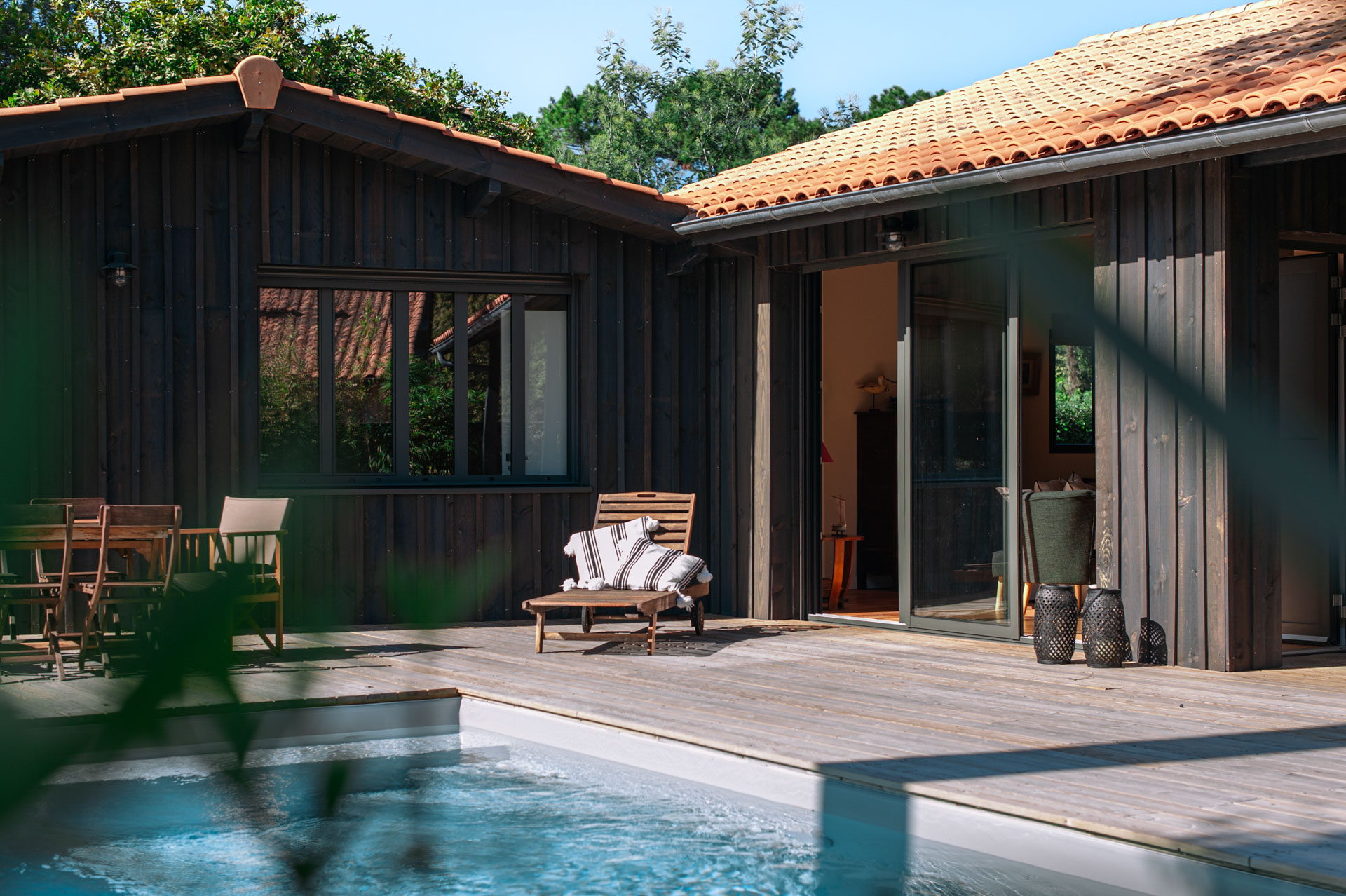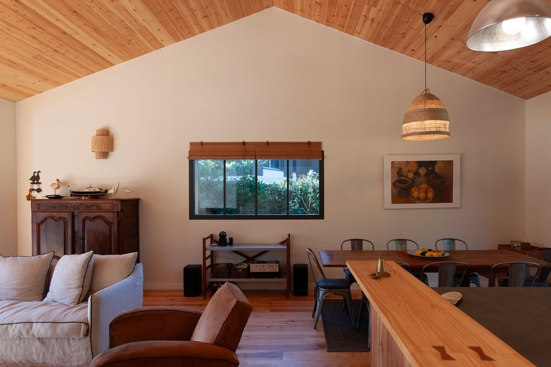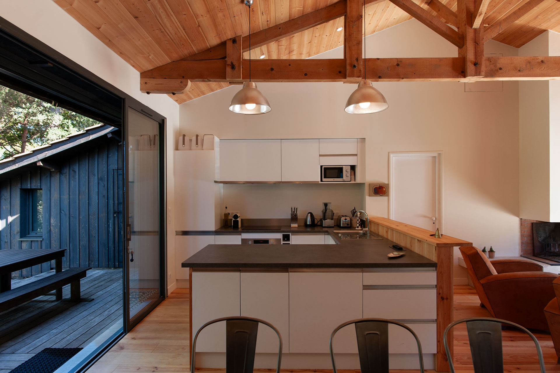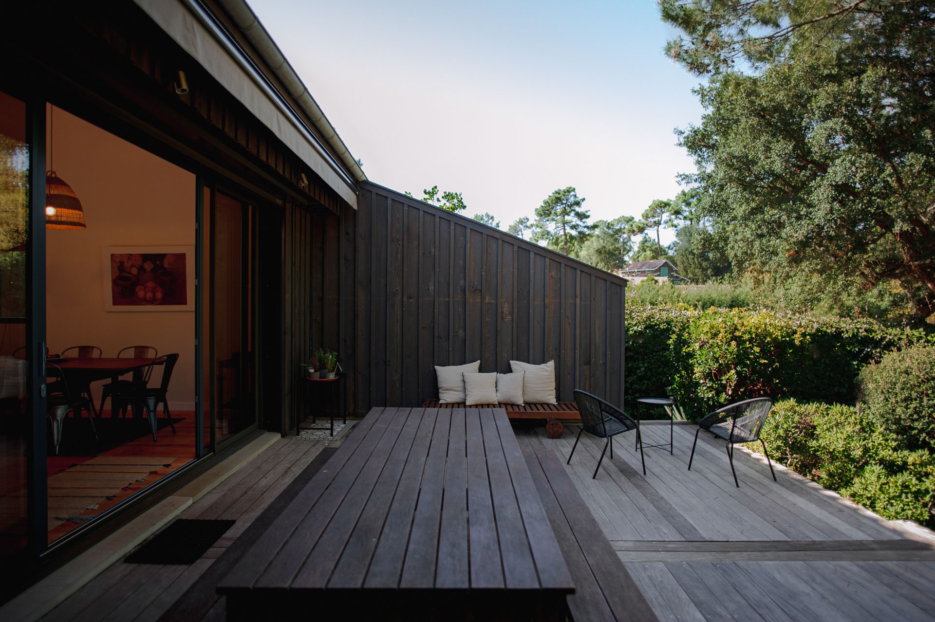 La maison s’agrandit et multiplie surtout ses scénarios d’usage tout en révélant les volumes préexistants. Le séjour se voit rénové, agrandi, se tourne vers ces extérieurs, bardés de bois foncé.
