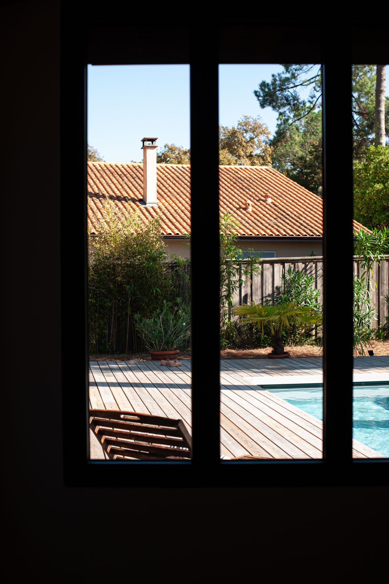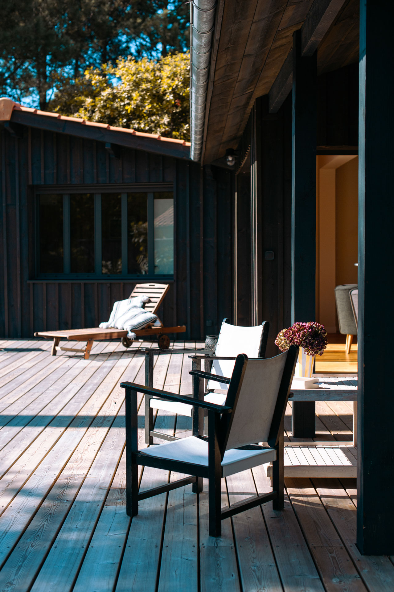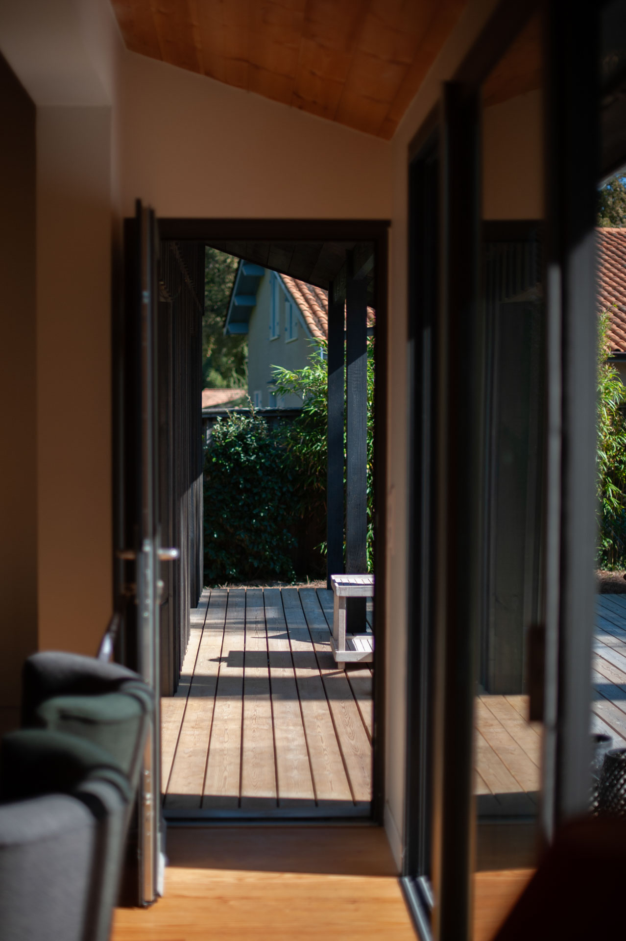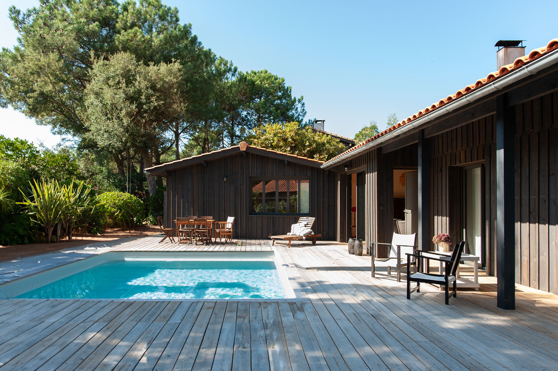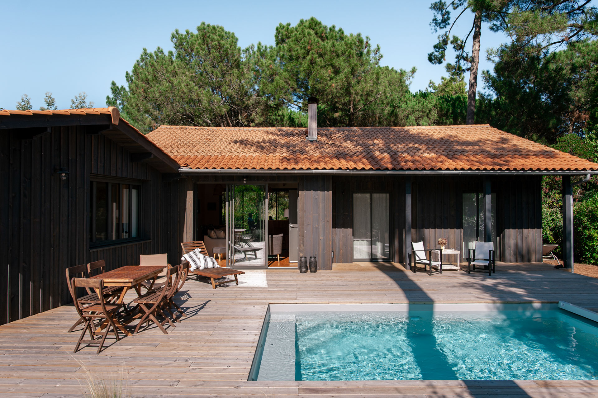 La maison s’agrandit et multiplie surtout ses scénarios d’usage tout en révélant les volumes préexistants. Le séjour se voit rénové, agrandi, se tourne vers ces extérieurs, bardés de bois foncé.