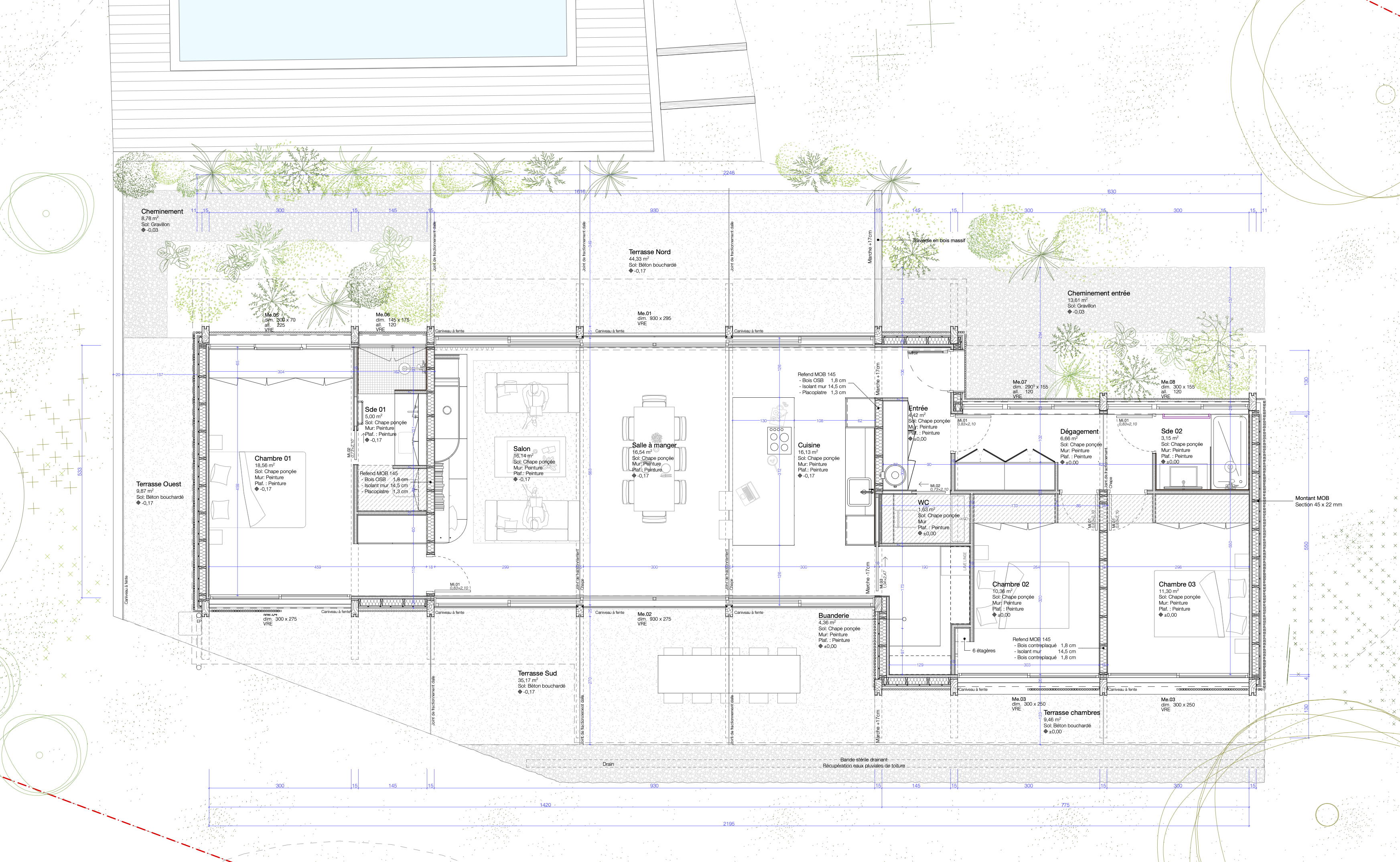 Un travail paysager vient compléter l’ensemble : de grands massifs plantés d’espèces dunaires délimitent les différents usages extérieurs et ancrent le projet dans son contexte écologique et sensible.
