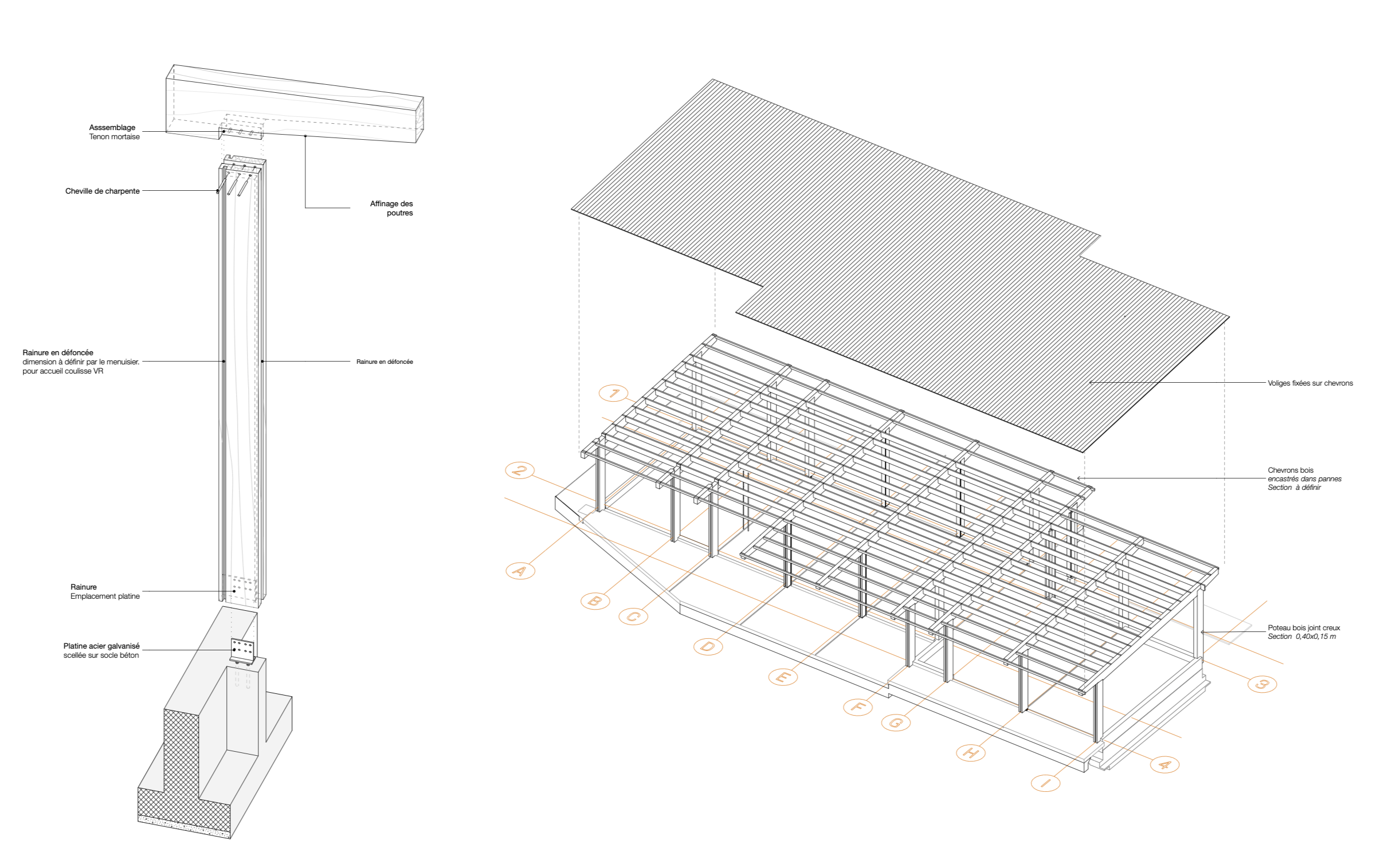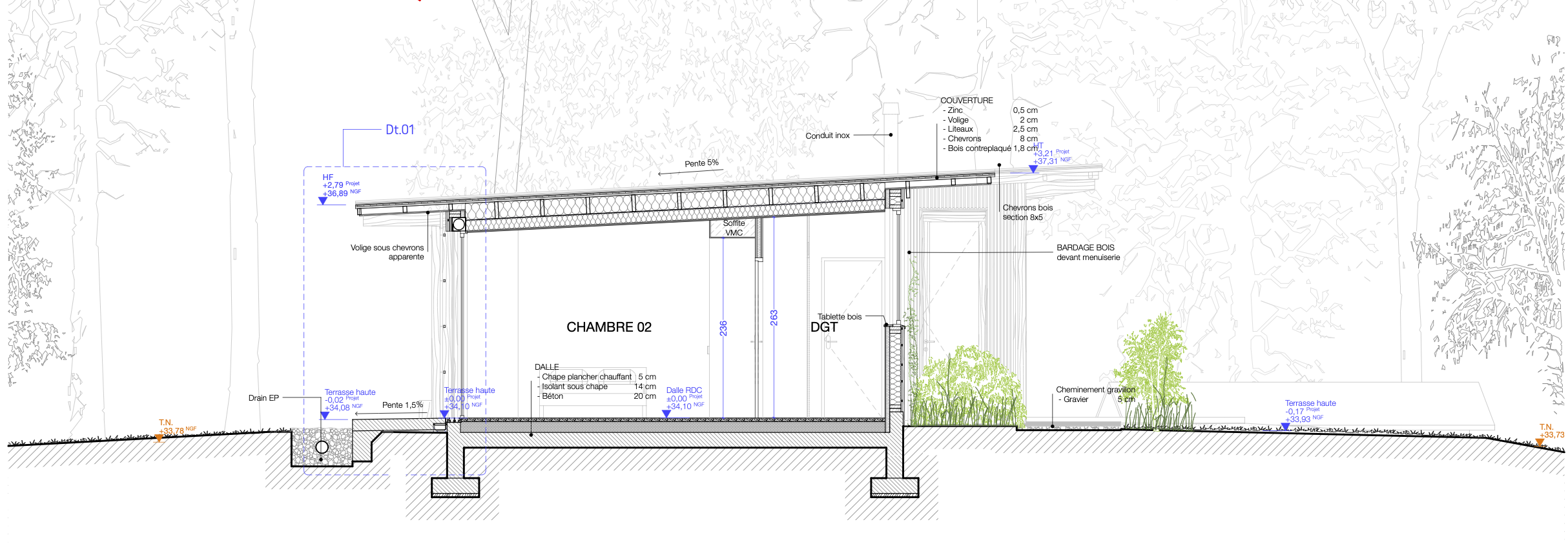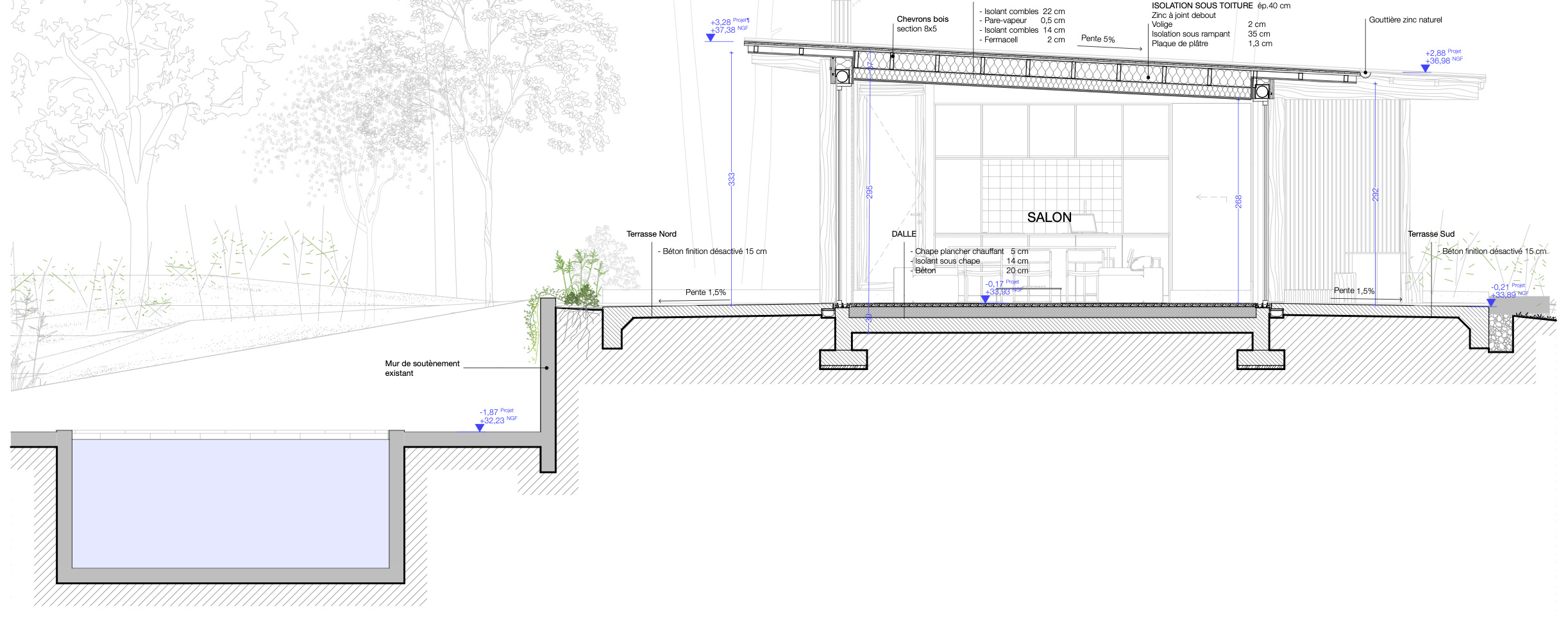 Insertion précise d’une nouvelle construction à ossature bois sur les traces d’une ancienne construction existante pour profiter au maximum des vues qu’offre le terrain et s’adapter au mode de vie dedans/dehors des clients.