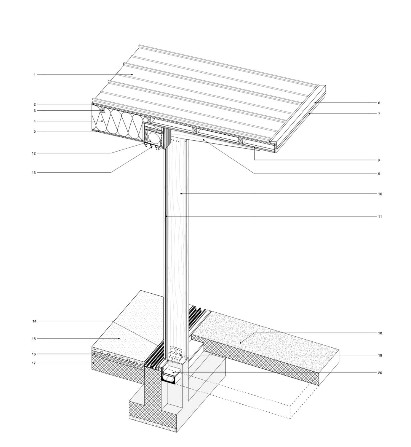 La maison est construite en ossature bois, isolée en laine de bois et revêtue d’un bardage bois naturel. Une toiture monopente en zinc s’étend largement au-delà des façades, formant de profonds avant-toits qui protègent les ouvertures et créent des ombrages naturels. Le sol en béton poli, continu du dedans vers le dehors, renforce l’unité spatiale et l’usage fluide des terrasses extérieures.
