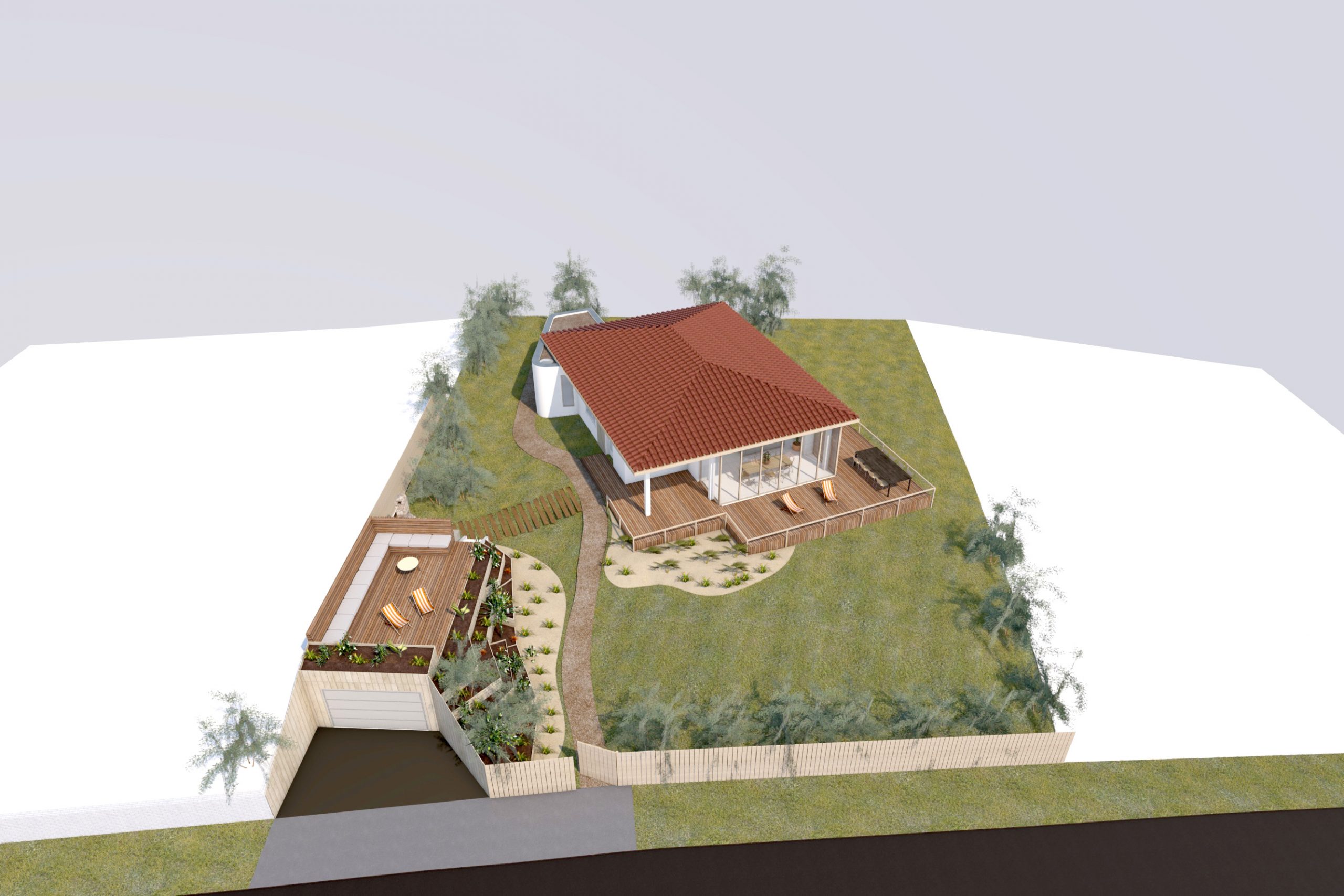 Le projet prévoit également de moderniser le séjour et la véranda afin de profiter pleinement de la maison l’été. Une terrasse à l’Ouest vient se prolonger dans le jardin, qui lui même est totalement repensé afin de jouir des espaces extérieurs. L’aménagement paysager vient également couvrir le garage extérieur dans le but de le masquer.