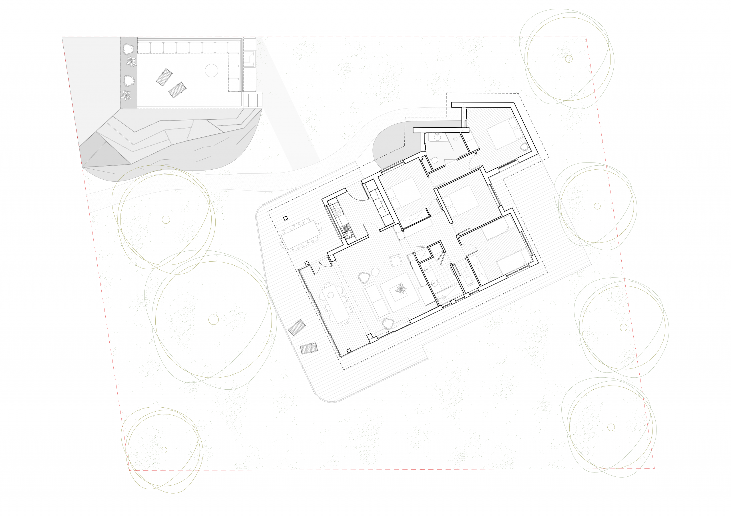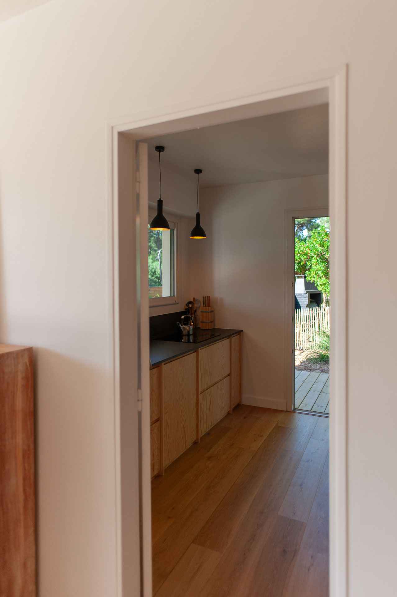 On vient ajouter une dépendance à cette maison de vacances. L’extension vient s’intégrer dans l’angle de la maison en s’orientant vers les diagonales les plus longues afin de bénéficier d’une profondeur de champ du jardin et donne de la perspective aux nouveaux espaces.