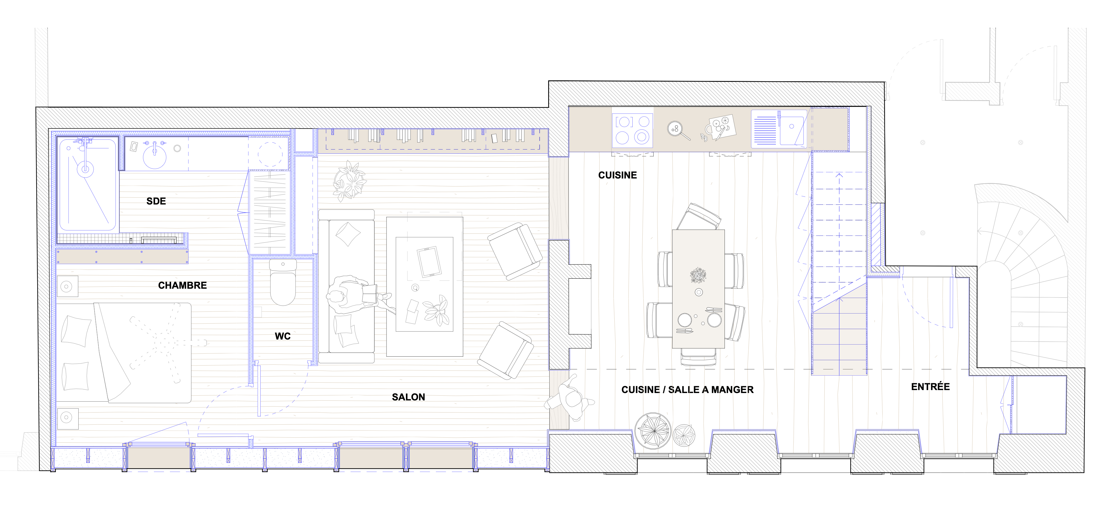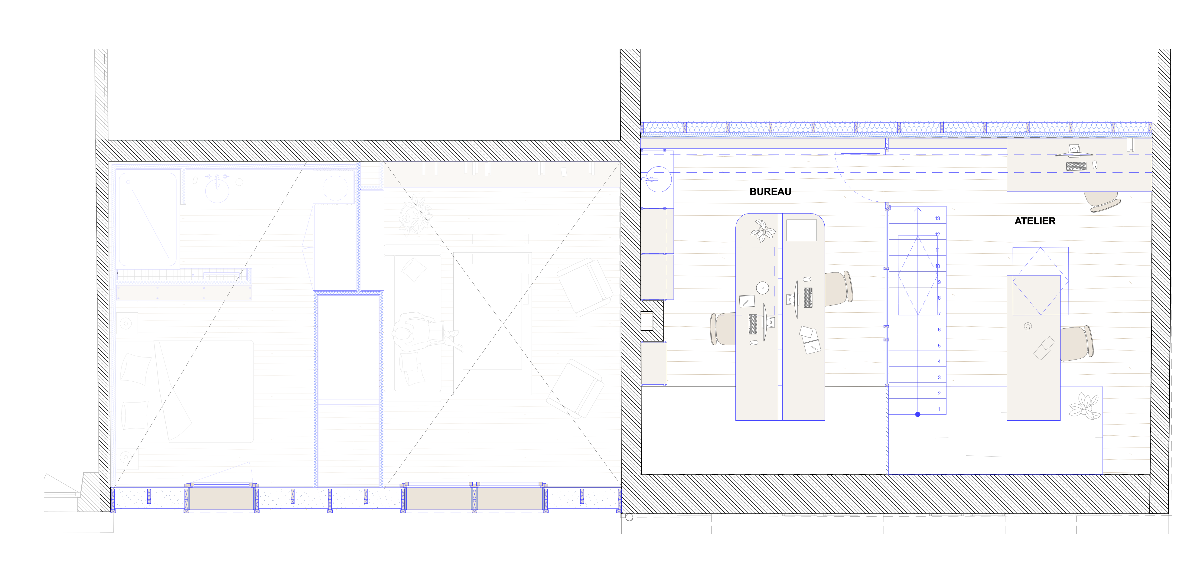 L’appartement initial se décomposait en deux volumes distincts. Le premier, caractérisé par une façade en pierre offre une généreuse hauteur sous plafond de plus de 3,20 mètres. Le second, sous rampant, ne disposait que de 7,5 m² exploitables à plus de 1,80 m de hauteur, bien que couvrant 30 m² au sol.