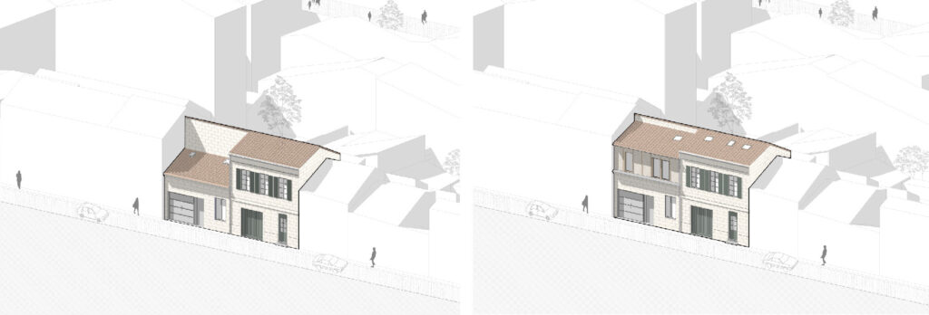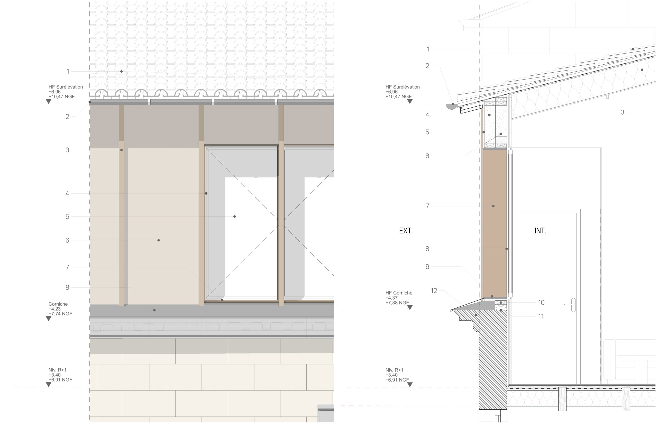 La surélévation s’est naturellement implantée sur ce volume bas, tandis que les combles ont été aménagés dans la partie haute pour gagner un espace supplémentaire.