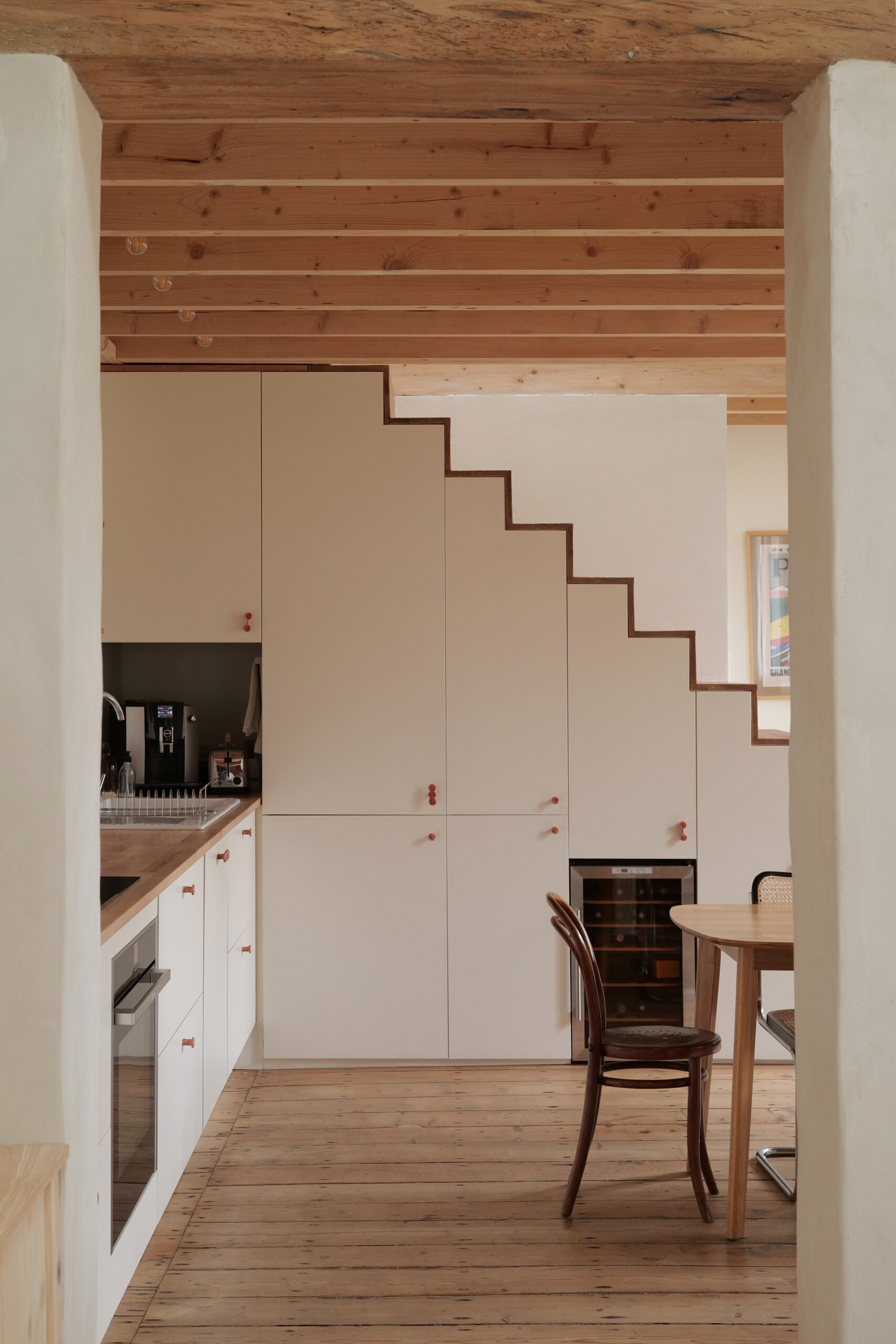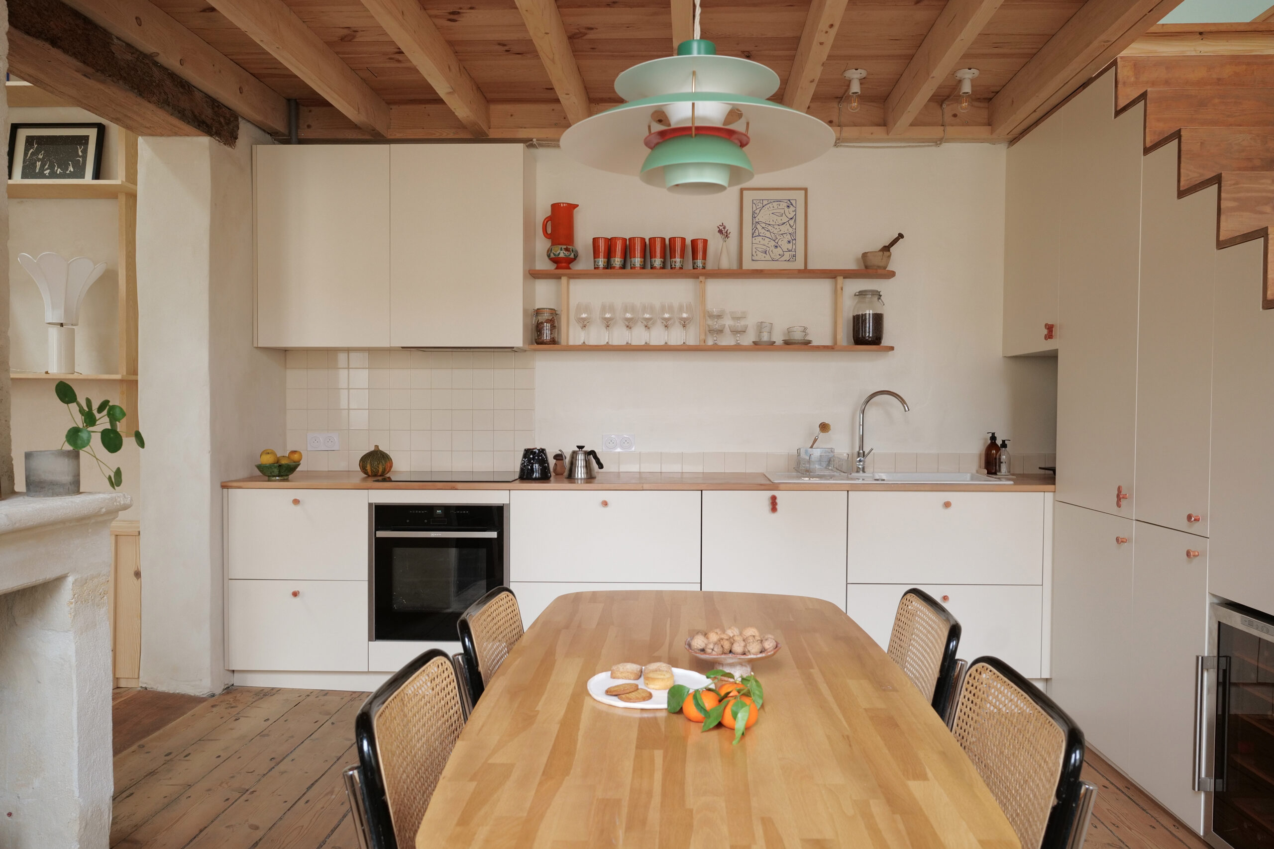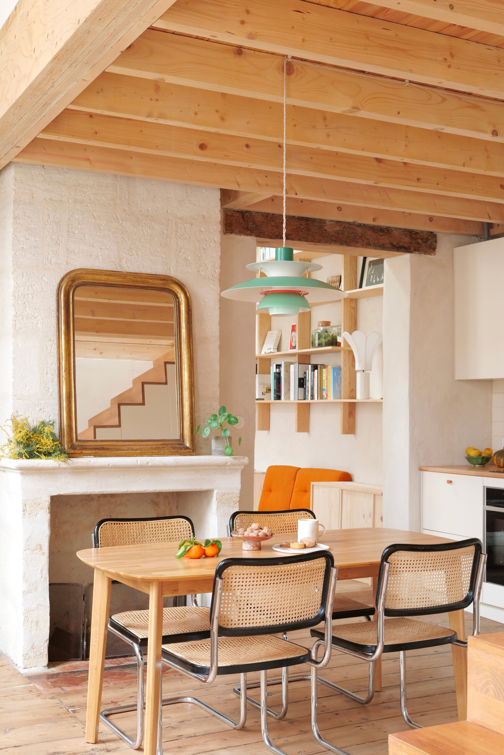 La distribution des pièces a été pensée en enfilade pour favoriser une circulation fluide le long de la façade. L’entrée donne sur un escalier qui structure l’espace tout en séparant visuellement la cuisine et la salle à manger. Une cheminée traversante marque la transition vers le salon, situé dans la partie surélevée. La chambre parentale et la salle de bain prolongent cet espace. Dans la partie ancienne, les combles ont été récupérés pour y installer une chambre et un bureau.