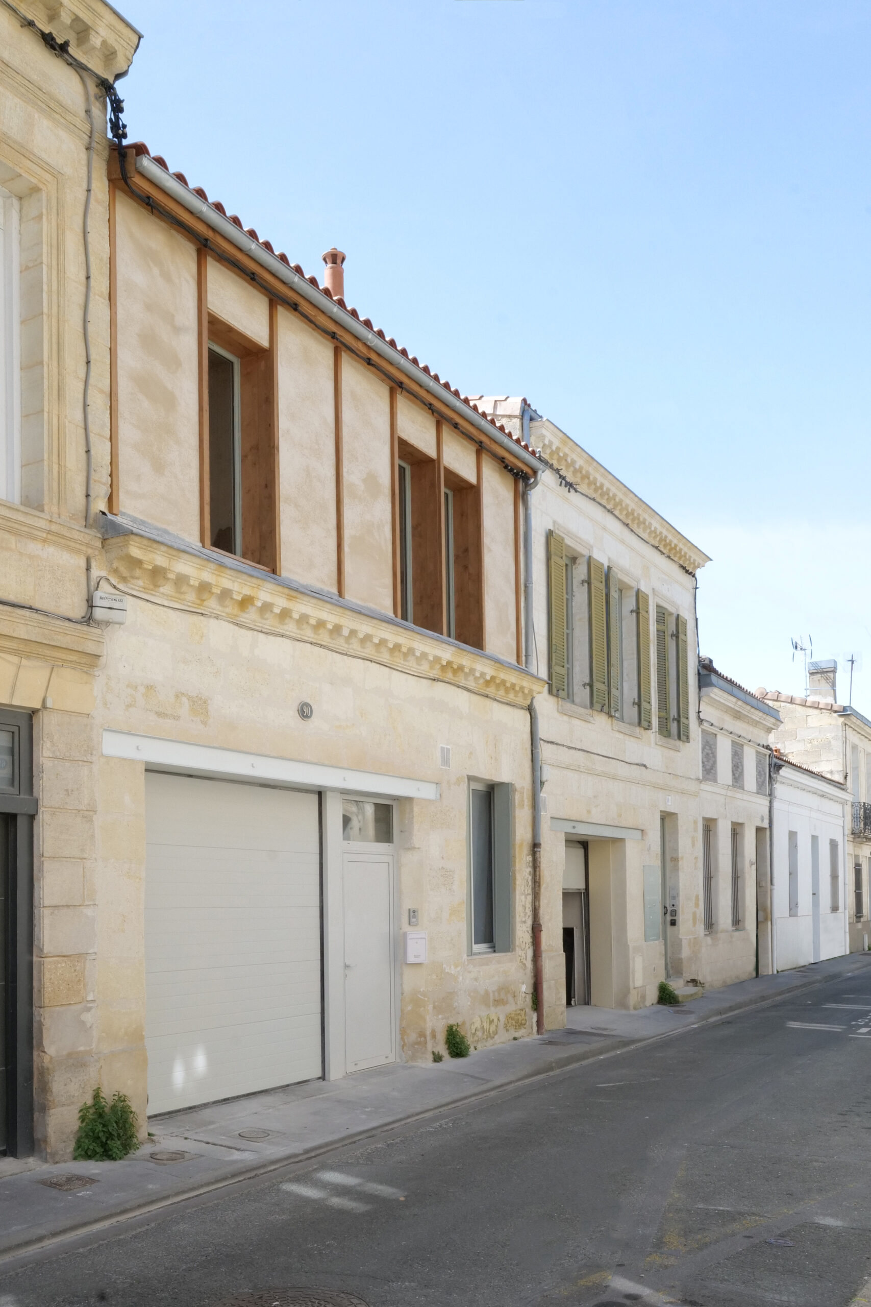 L’ensemble du projet valorise les matériaux existants : les anciennes poutres ont été réemployées en linteaux et en mobilier, le plancher d’origine a été conservé.  La façade de la partie surélevée reprend les proportions des ouvertures existantes mais les réinterprète dans une composition plus contemporaine, soulignée par une trame de montants en bois qui lui apporte un côté naturel.