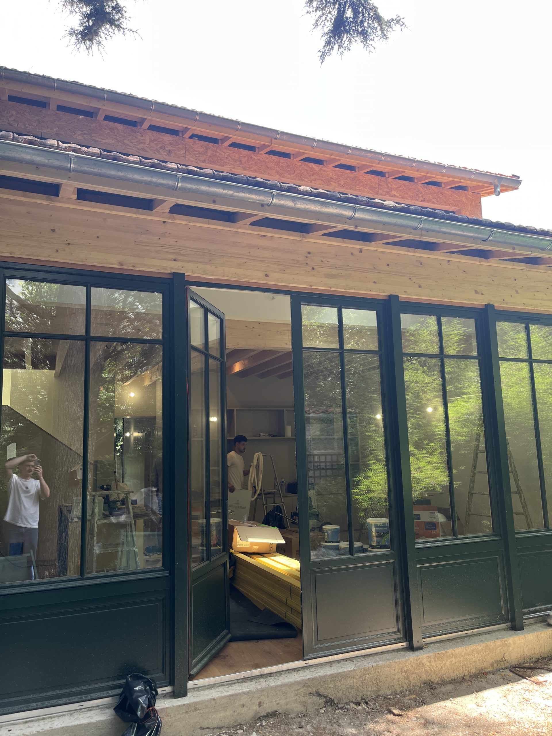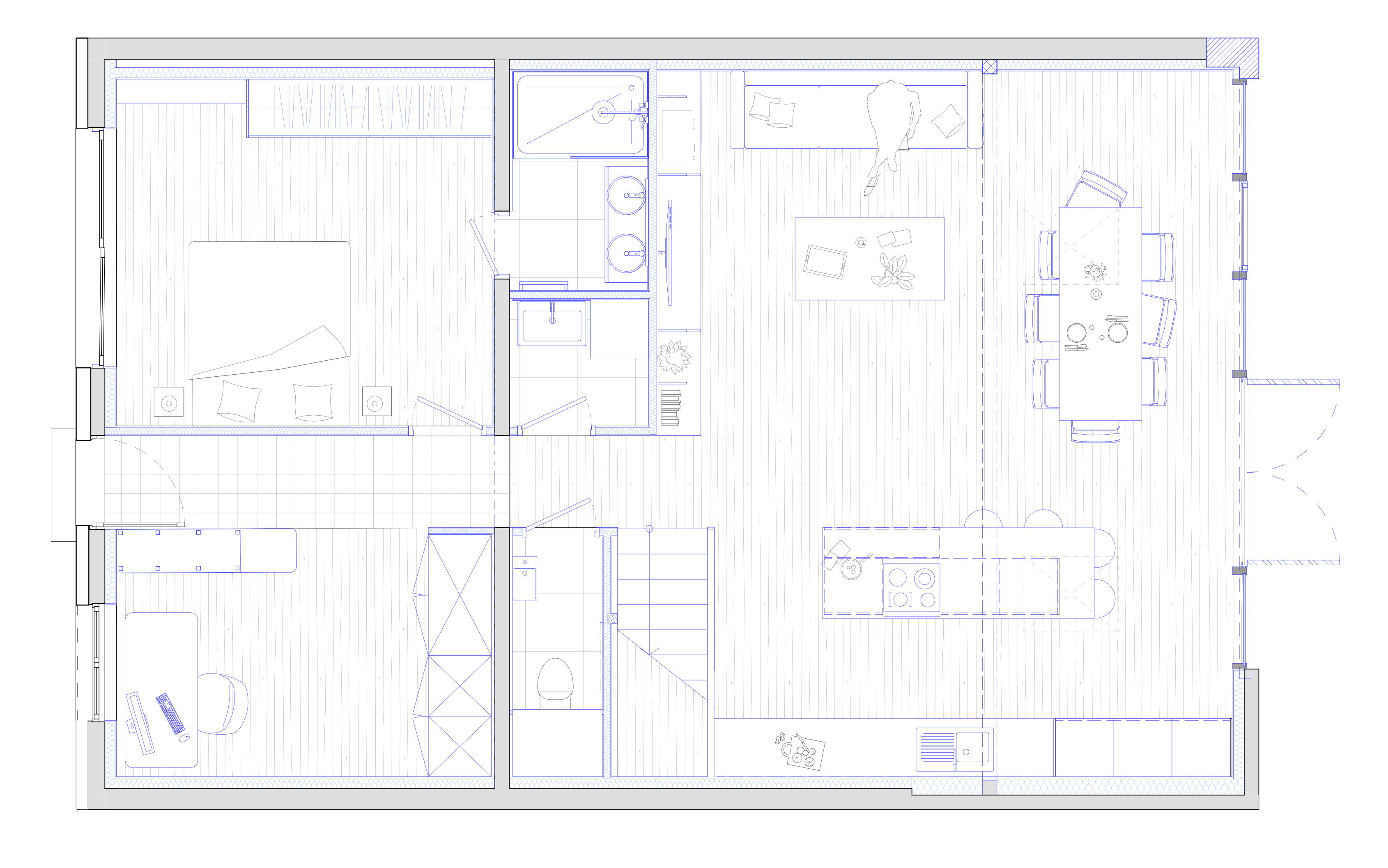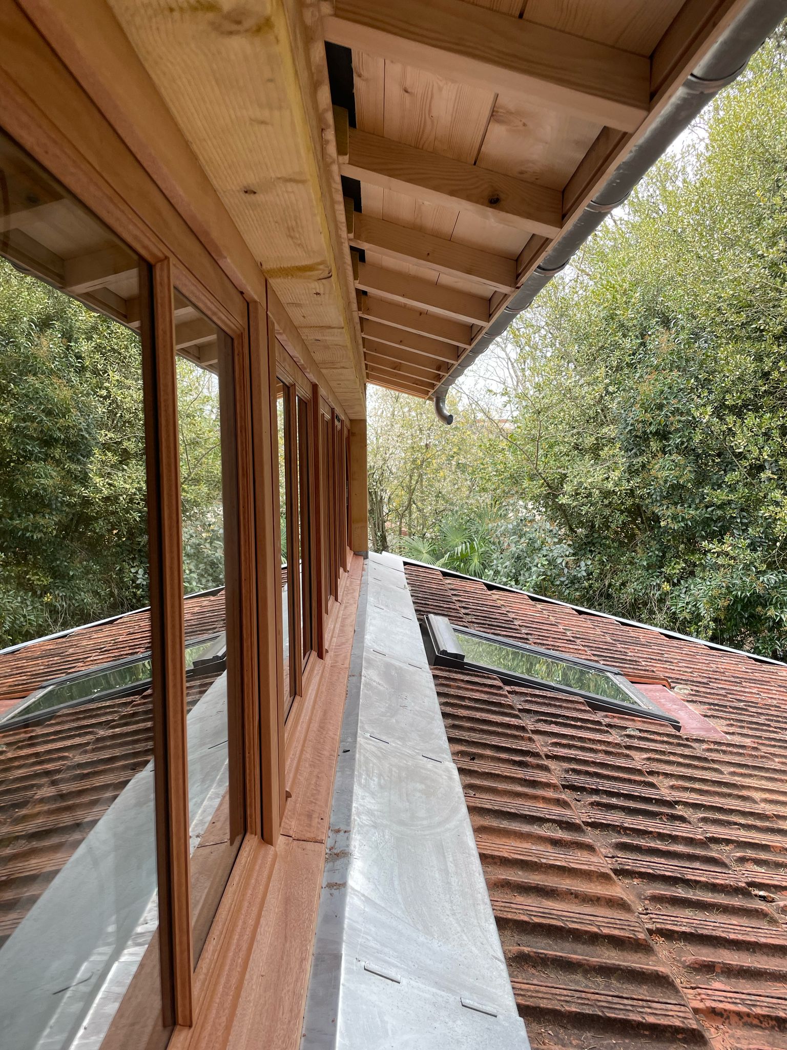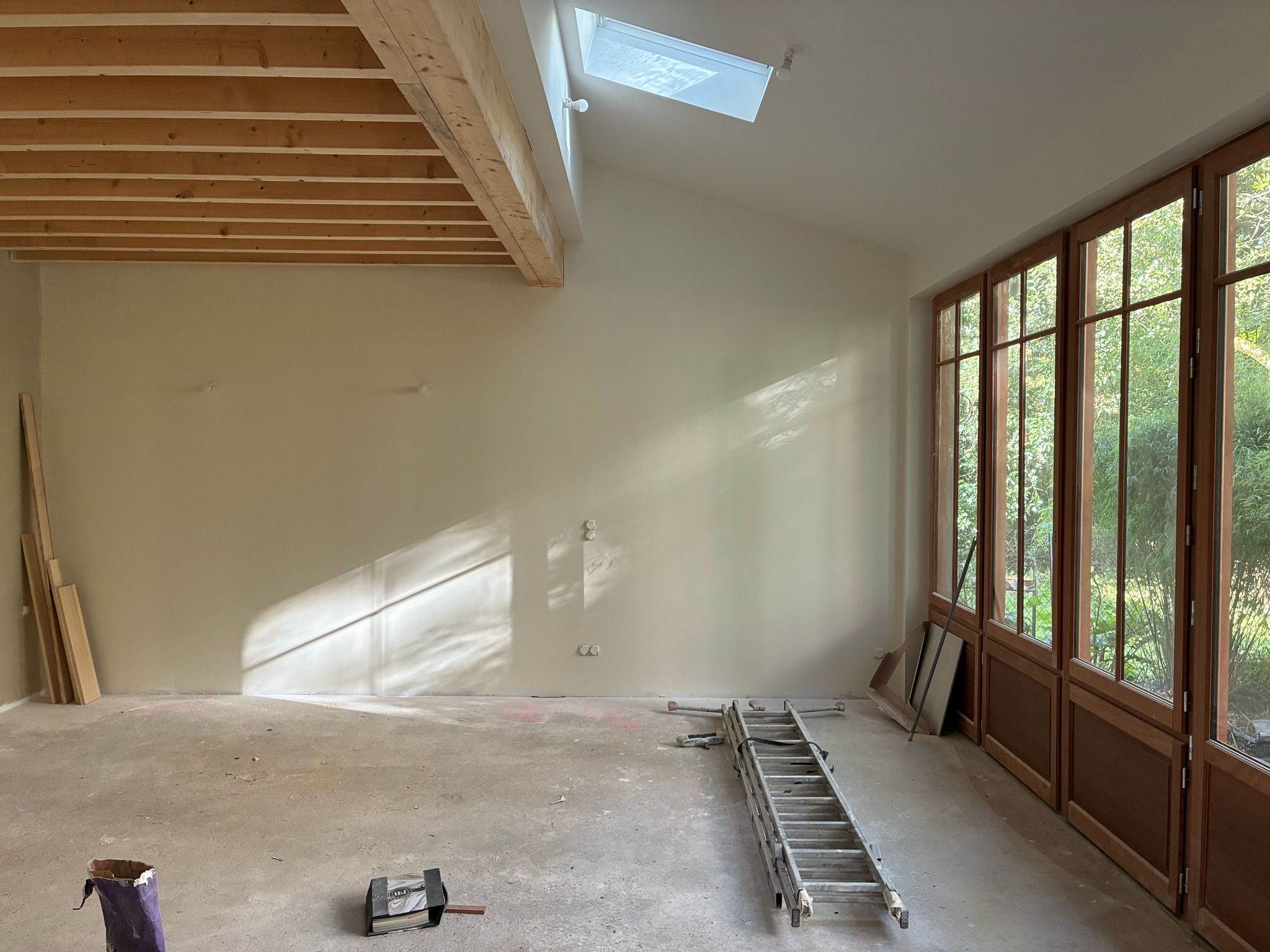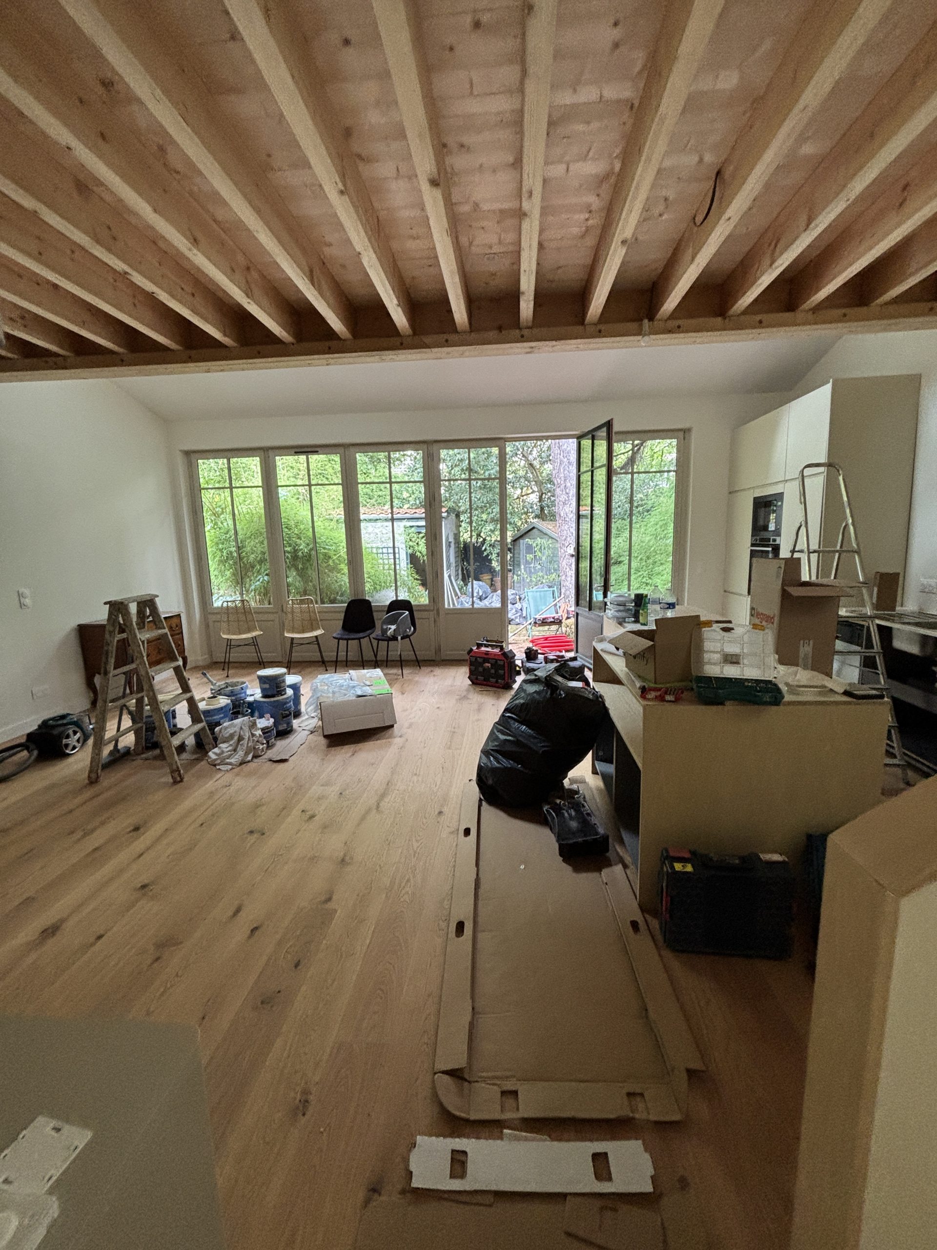La surélévation, entièrement réalisée en structure bois, est isolée par l’extérieur en fibre de bois et enduite à la chaux, selon des principes bioclimatiques et respectueux du bâti ancien. La façade arrière est largement ouverte grâce à de grandes menuiseries bois, permettant un apport généreux de lumière naturelle. Le plancher en bois massif laissé apparent participe à une atmosphère chaleureuse et continue.