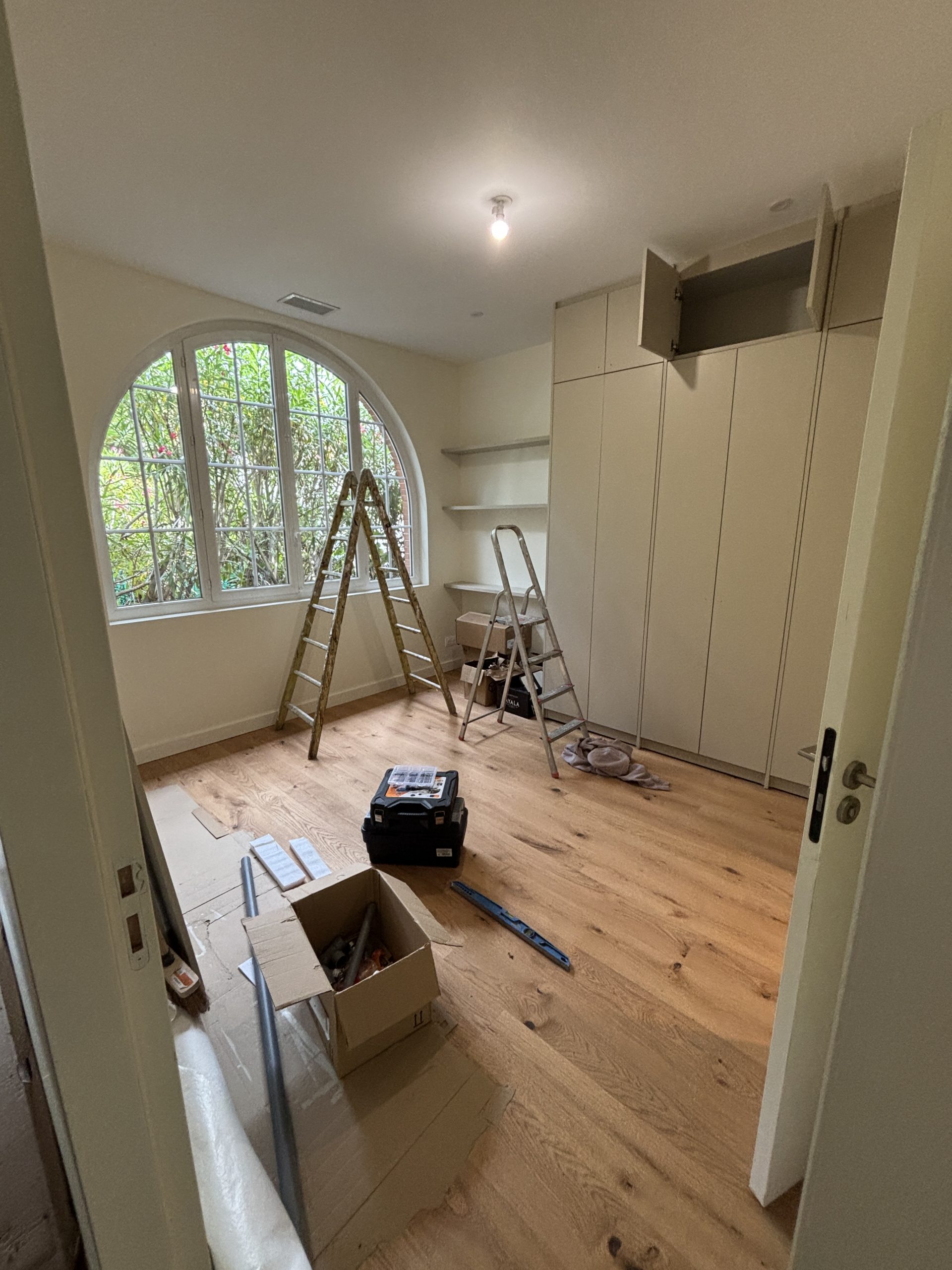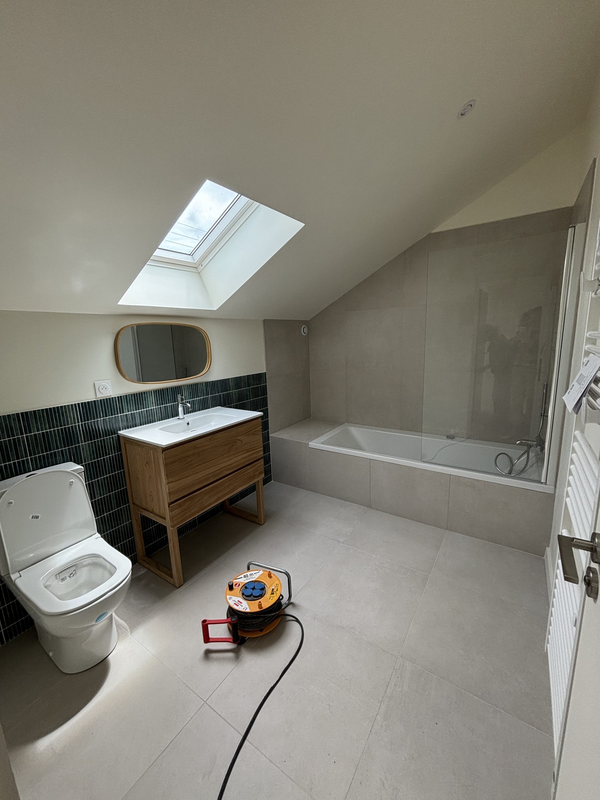 Une attention particulière a été portée à l’intégration du mobilier sur mesure : banc d’entrée avec rangements pour les chaussures, bibliothèque multifonctions, escalier intégré à la cuisine… Chaque élément a été pensé en lien direct avec les usages de la famille, dans une logique de simplicité, de fluidité et de durabilité.
